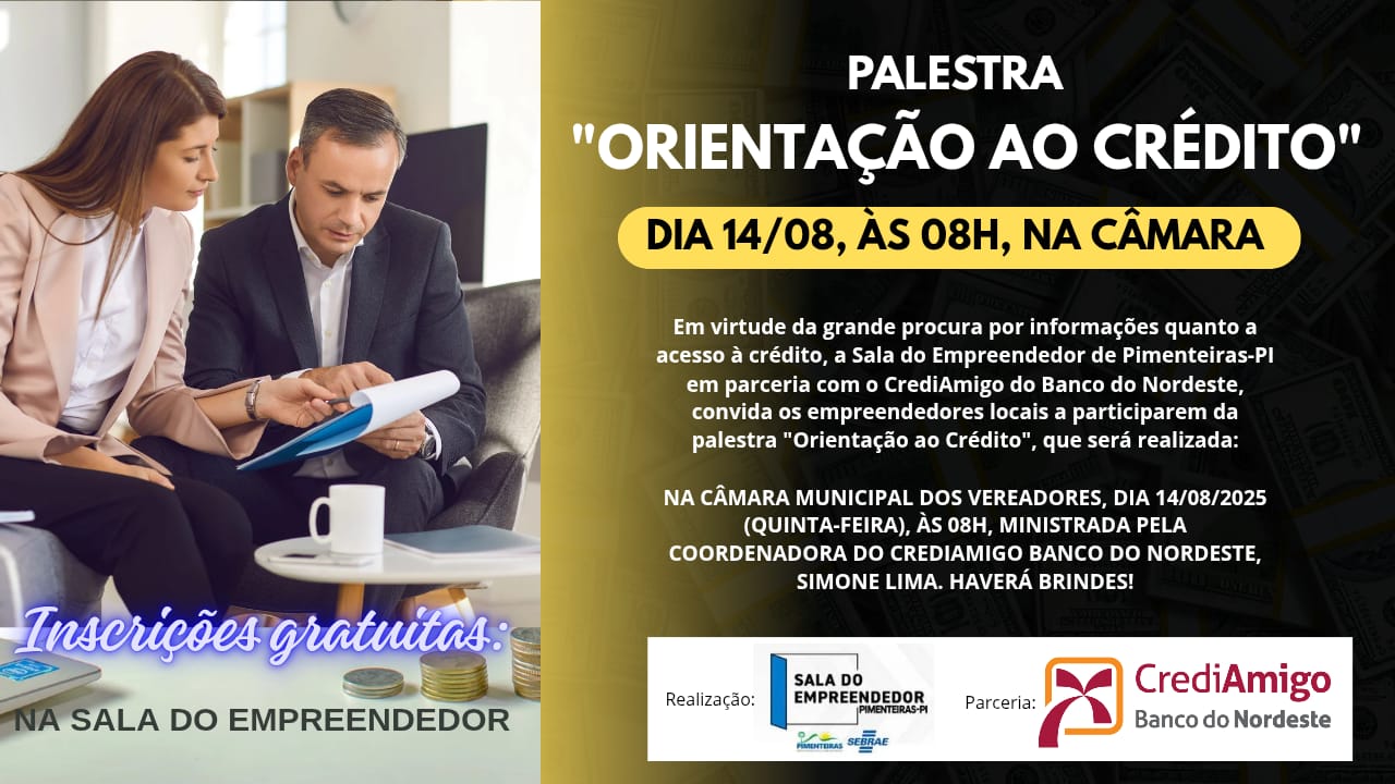 na Câmara Municipal dos Vereadores, dia 14/08/2025 (quinta-feira), às 08h, ministrada pela coordenadora do Crediamigo Banco do Nordeste, Simone Lima. Haverá brindes!
