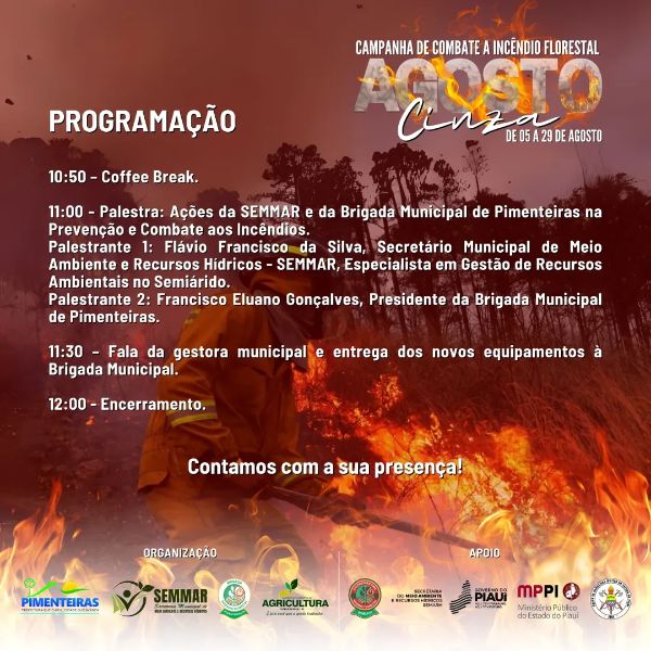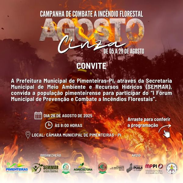 Data: 25/08/2025A Prefeitura Municipal de Pimenteiras-PI, através da Secretaria Municipal de Meio Ambiente e Recursos Hídricos (SEMMAR), tem a honra de convidar toda a população pimenteirense para participar do “I Fórum Municipal de Prevenção e Combate a Incêndios Florestais”. Data: 26 de agosto Horário: a partir das 8h da manhã Local: Câmara Municipal de Pimenteiras Contamos com a sua presença!