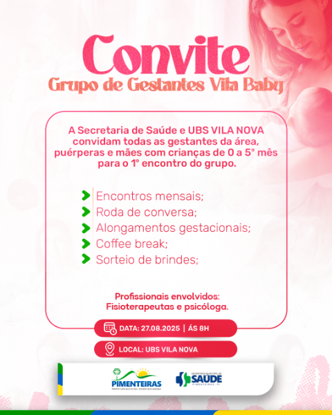 Data: 25/08/2025Convite Especial para Gestantes* *Grupo “Vila Baby”* Você, gestante, é nossa convidada para participar do *1º Encontro* do nosso grupo! Encontros mensais Data: 27/08/2025 Horário: 8h Local: UBS Vila Nova Venha compartilhar experiências, receber informações importantes e se conectar com outras futuras mamães!