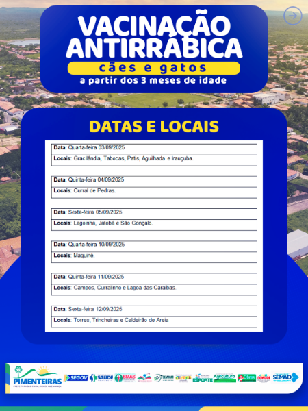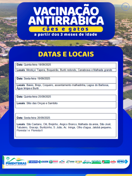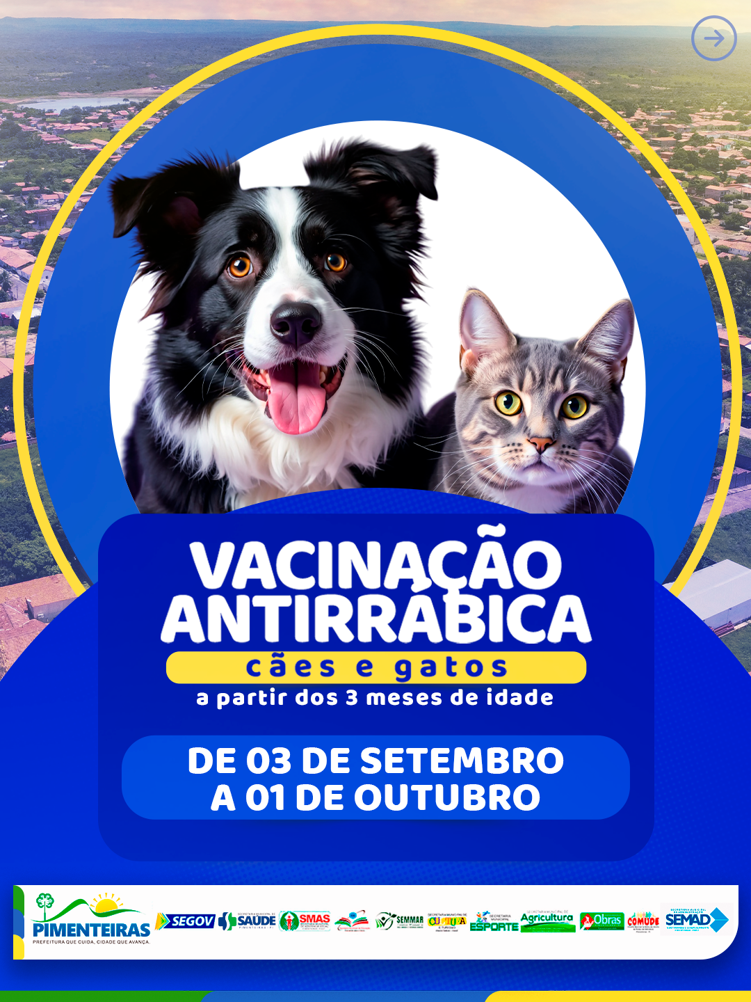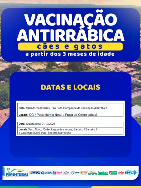 Data: 01/09/2025A Prefeitura de Pimenteiras convida todos os tutores para a Campanha de Vacinação Antirrábica 2025!