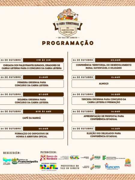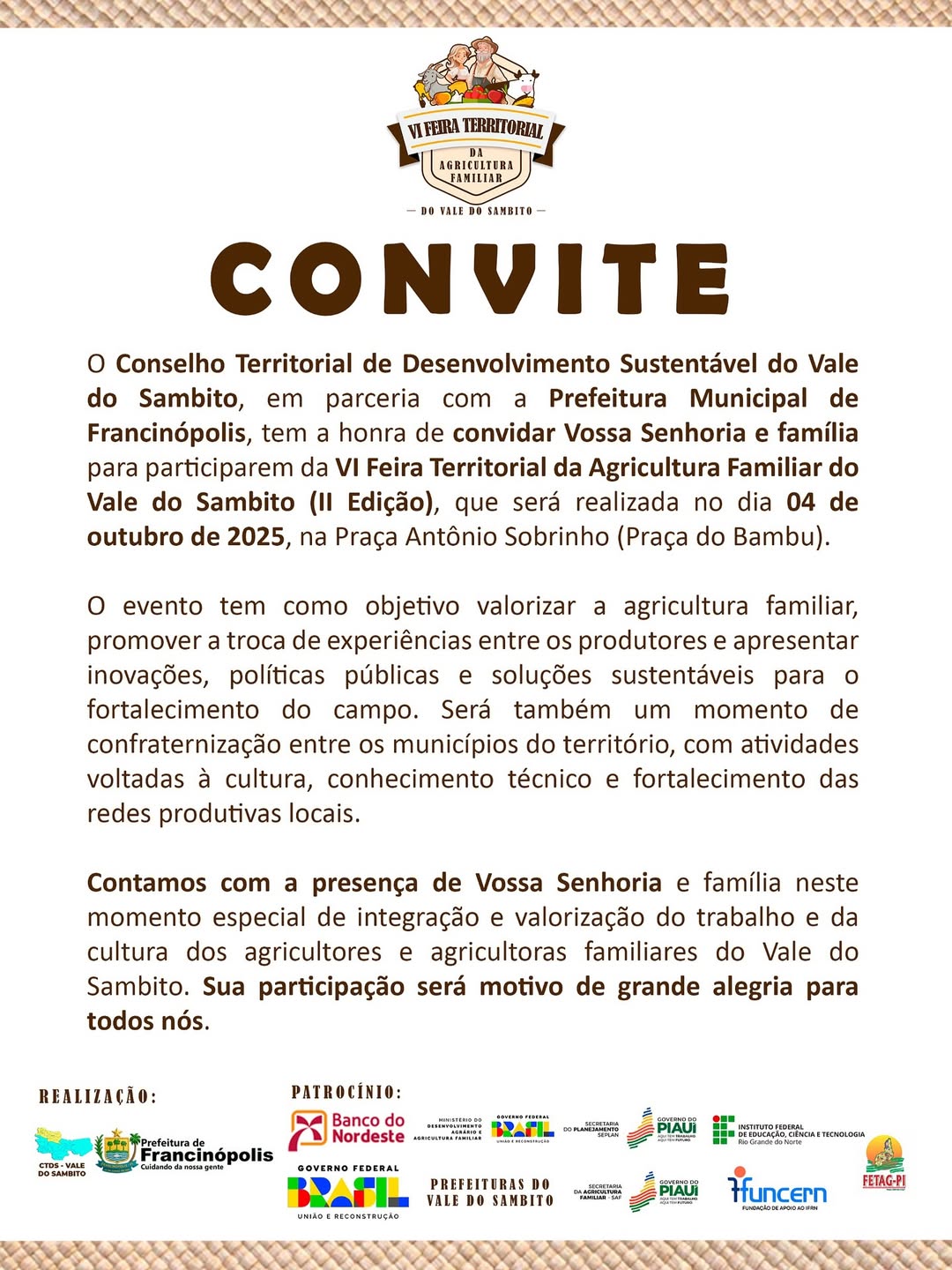 Data: 10/09/2025No dia 04 de outubro de 2025, a cidade de Francinópolis sediará este grande evento que valoriza a agricultura familiar, promove a troca de experiências, apresenta inovações e fortalece o campo.