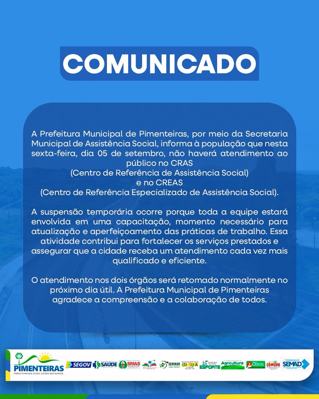 Data: 10/09/2025A Prefeitura de Pimenteiras, por meio da Secretaria de Assistência Social, informa que nesta sexta-feira, 05/09, não haverá atendimento no CRAS e no CREAS. As equipes estarão em capacitação para aprimorar os serviços prestados.