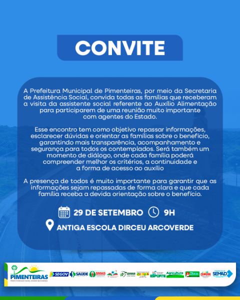 Data: 23/09/2025A Prefeitura de Pimenteiras, por meio da Secretaria de Assistência Social, convida as famílias que receberam a visita da assistente social sobre o Auxílio Alimentação para uma reunião com agentes do Estado.