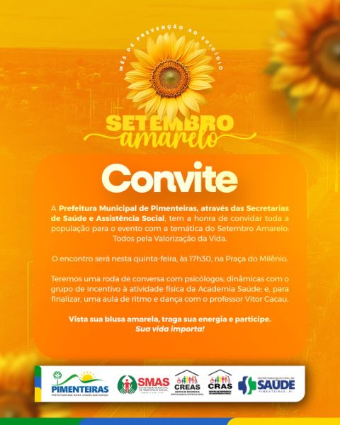 Data: 23/09/2025A Prefeitura de Pimenteiras, por meio das Secretarias de Saúde e Assistência Social, convida toda a população para participar do grande encontro pela Valorização da Vida.