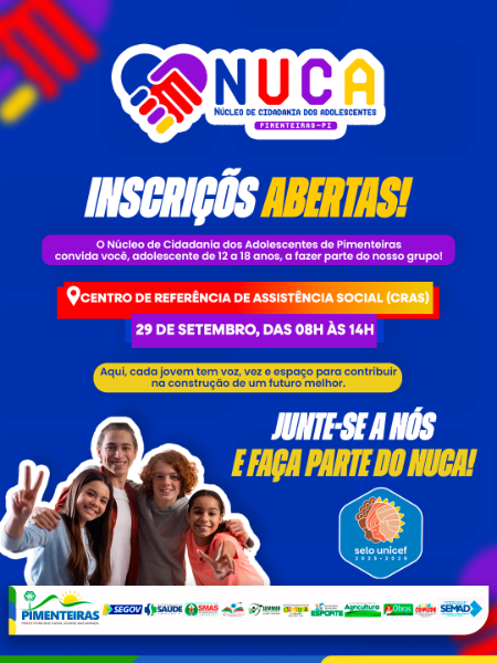 Data: 01/10/2025O Núcleo de Cidadania dos Adolescentes de Pimenteiras – NUCA convida jovens de 12 a 18 anos para fazer parte desse grande movimento de transformação.