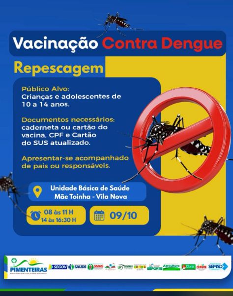 Nesta quarta-feira, 09 de outubro, acontece a repescagem da vacinação contra a dengue para crianças e adolescentes de 10 a 14 anos.
