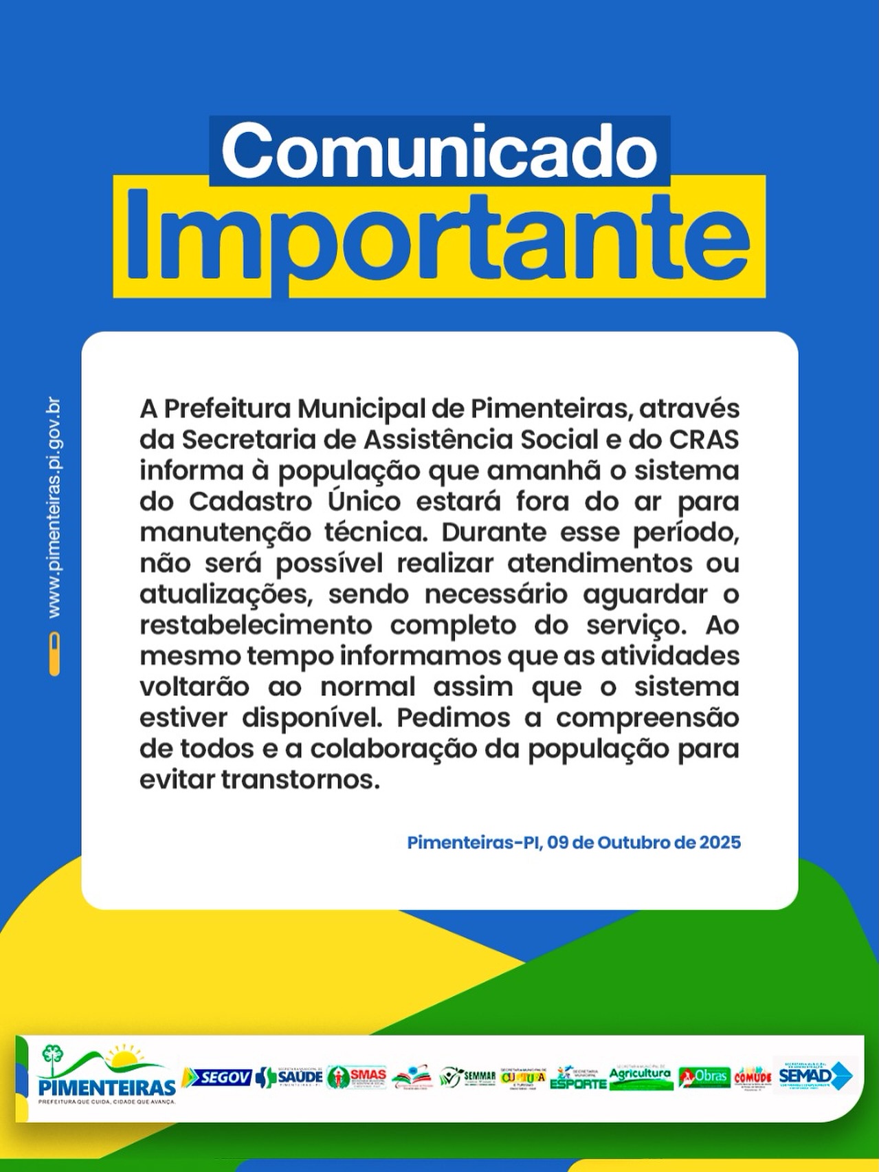Data: 16/10/2025A Prefeitura Municipal de Pimenteiras, por meio da Secretaria de Assistência Social e do CRAS, informa à população que amanhã o sistema do Cadastro Único estará fora do ar para manutenção técnica.