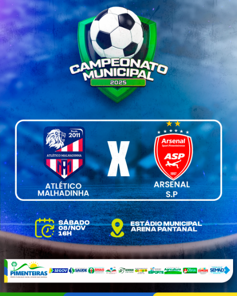 Neste sábado, 08 de novembro, às 16h, acontece mais uma partida entre Atlético Malhadinha e Arsenal S.P., no Estádio Municipal Arena Pantanal.