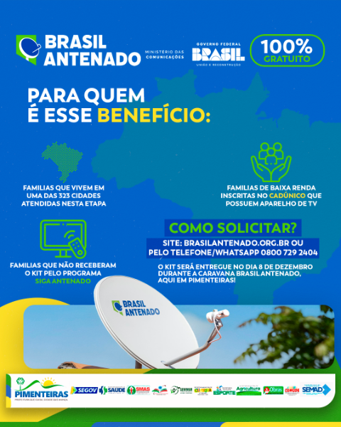 As famílias que realizarem o cadastro receberão o kit gratuito no dia 8 de dezembro, durante a Caravana Brasil Antenado, que estará presente no município.