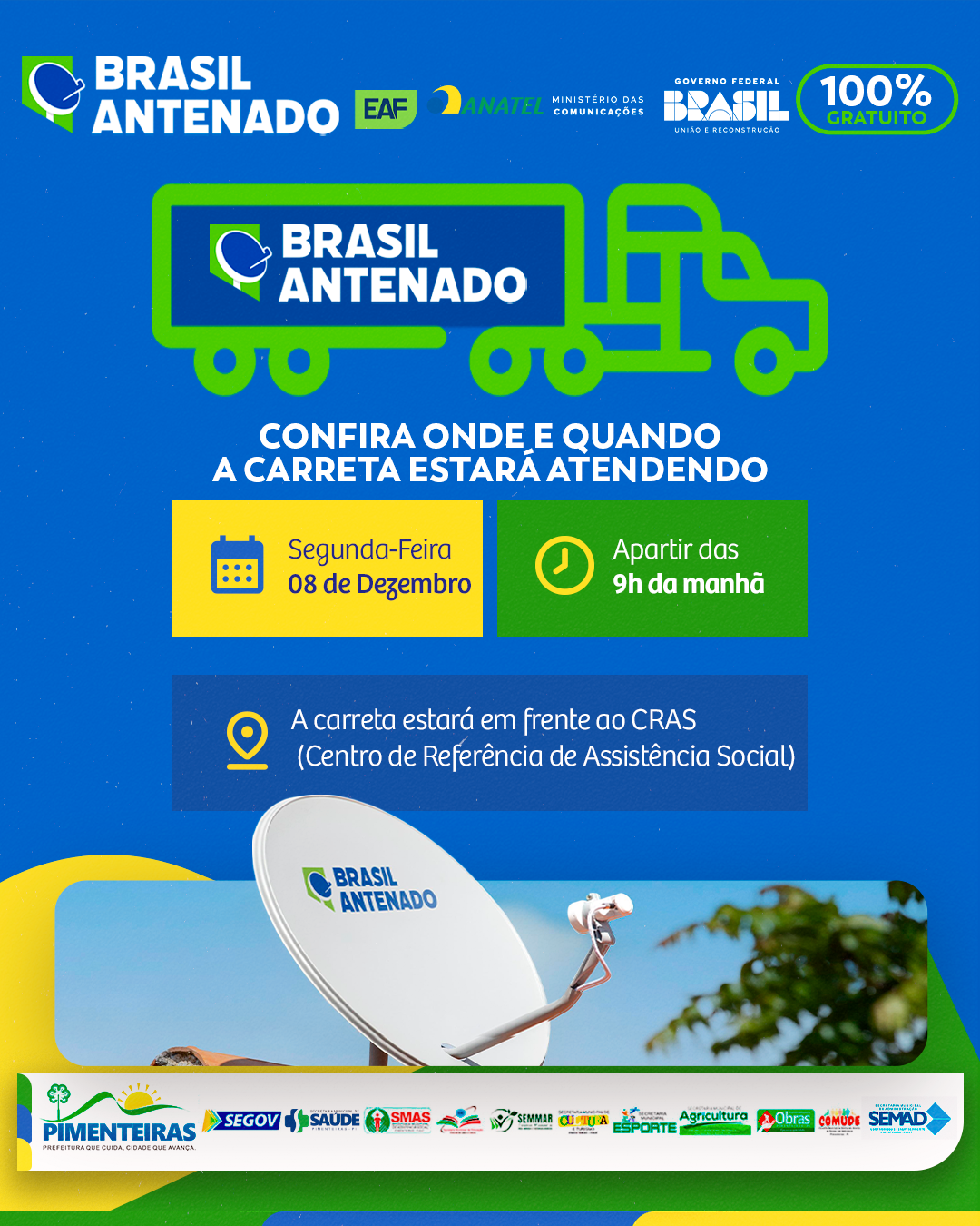 Data: 10/12/2025Nesta segunda-feira, 08 de dezembro, a população poderá acessar atendimento para garantir a parabólica digital totalmente gratuita, destinada às famílias inscritas no CadÚnico.