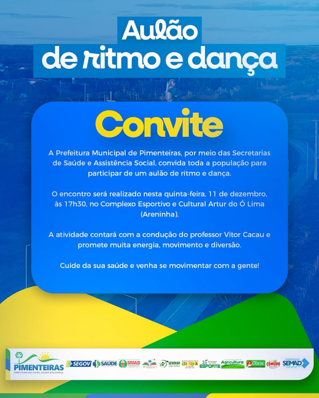 Data: 19/12/2025A Prefeitura de Pimenteiras, por meio das Secretarias Municipais de Saúde e Assistência Social, convida toda a população a participar do Aulão de Ritmo e Dança.