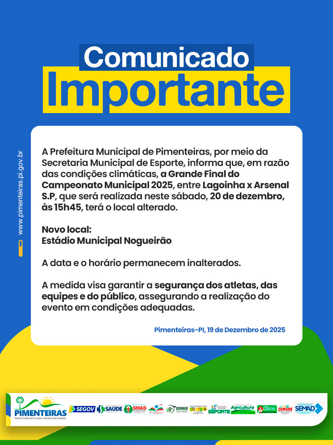 Data: 19/12/2025Em razão das condições climáticas, a Grande Final do Campeonato Municipal 2025 terá mudança de local.