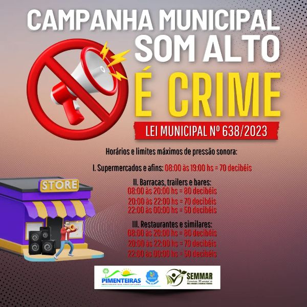 Data: 23/12/2025A Prefeitura de Pimenteiras desenvolve a Campanha Municipal “Som Alto é Crime”, com o objetivo de conscientizar a população sobre os impactos do excesso de ruído na saúde e no bem-estar coletivo. A exposição contínua a sons em volume elevado pode causar estresse, insônia, dor de cabeça e outros prejuízos à saúde.