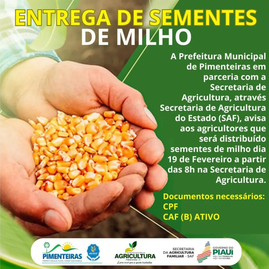 Data: 23/02/2026A Prefeitura Municipal de Pimenteiras, em parceria com a Secretaria Municipal de Agricultura e a Secretaria de Agricultura Familiar do Estado (SAF), informa que será realizada a distribuição de sementes de milho no dia 19 de fevereiro, a partir das 8h, na sede da Secretaria Municipal de Agricultura.