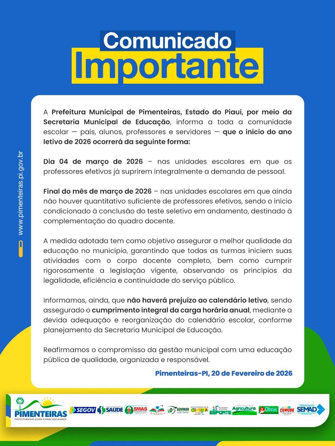 A Prefeitura Municipal de Pimenteiras, por meio da Secretaria Municipal de Educação, informa a toda a comunidade escolar — pais, professores, alunos e servidores — sobre o início do ano letivo de 2026: