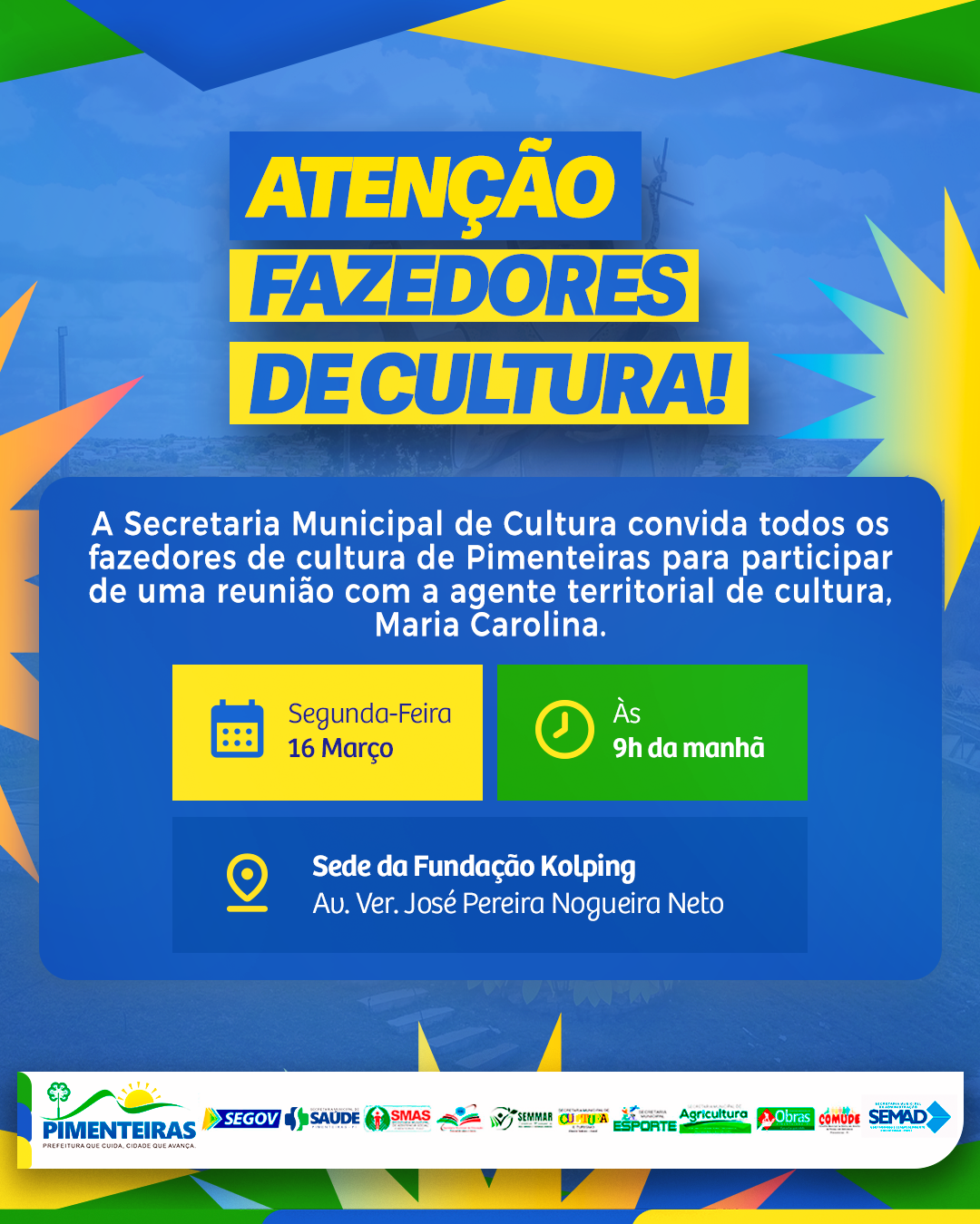 Data: 13/03/2026A Prefeitura de Pimenteiras, por meio da Secretaria Municipal de Cultura, convida artistas, produtores, grupos culturais e todos os fazedores de cultura do município para participarem de uma reunião com a agente territorial de cultura, Maria Carolina.
