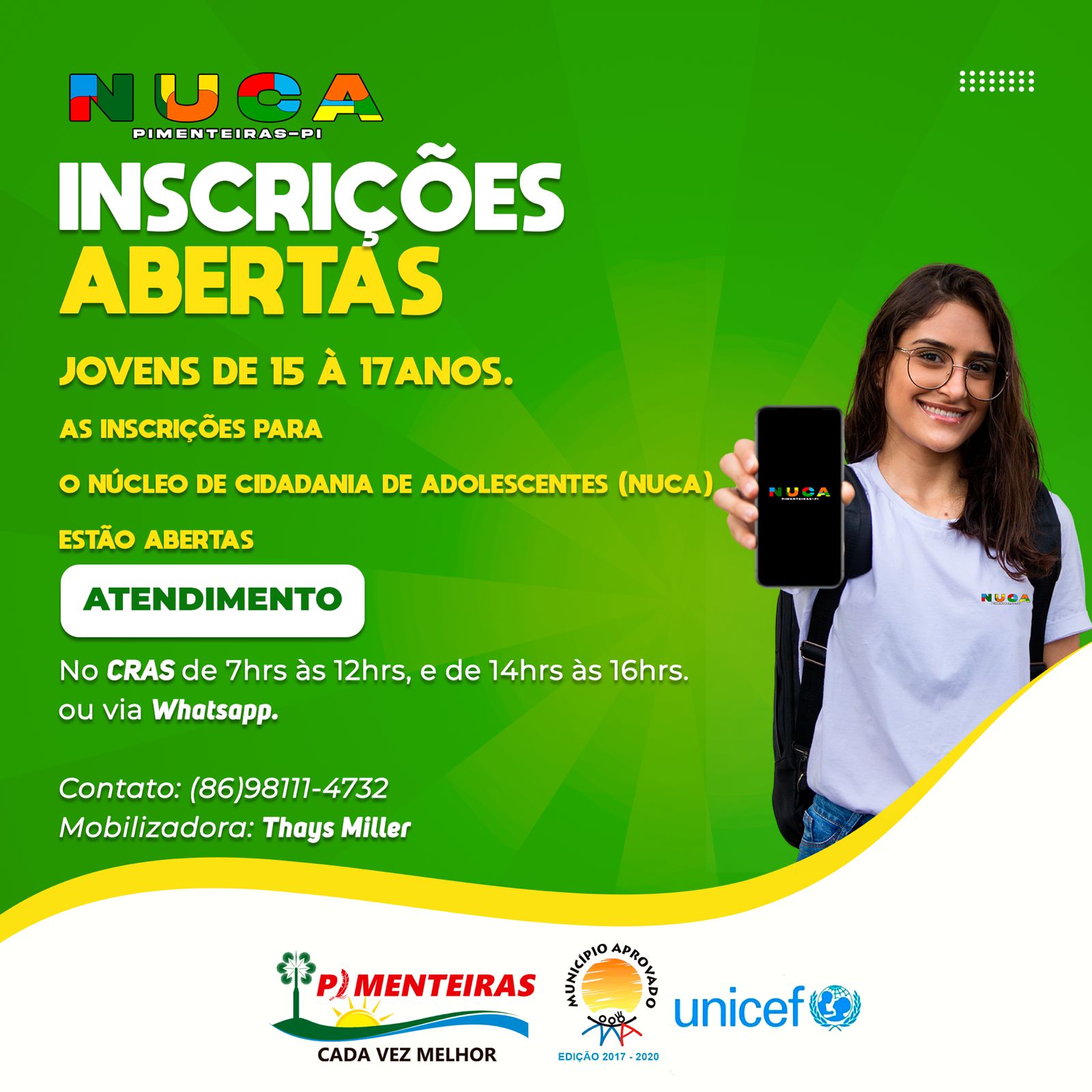 Venha participar do NÚCLEO DE CIDADANIA DOS ADOLESCENTES - NUCA, que é um espaço concedido a adolescentes e jovens para o desenvolvimento da cidadania, assim: trabalhando temáticas relacionadas a proteção, a orientação, a cuidado e muito mais. Existe toda uma equipe de apoio para esse desenvolvimento social.