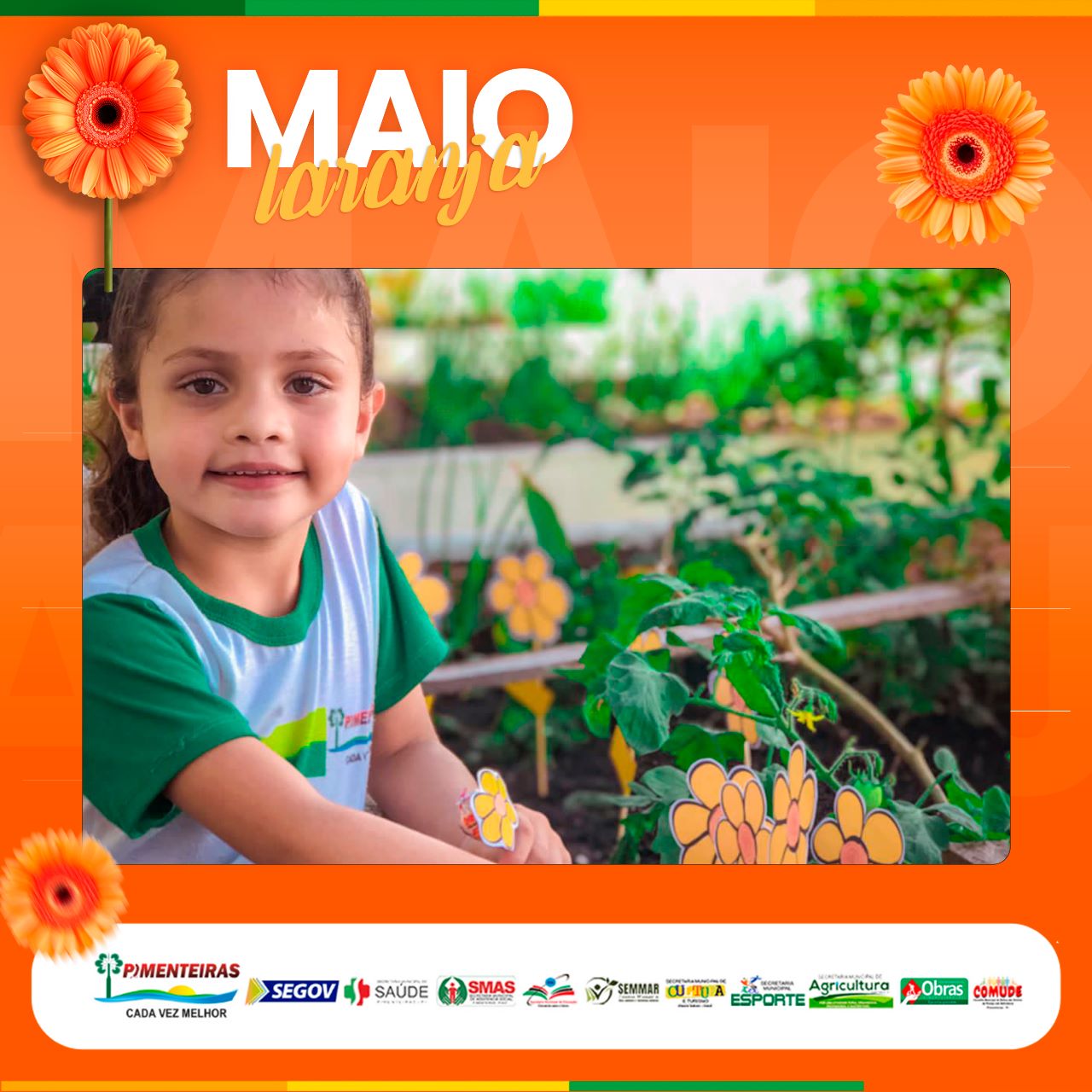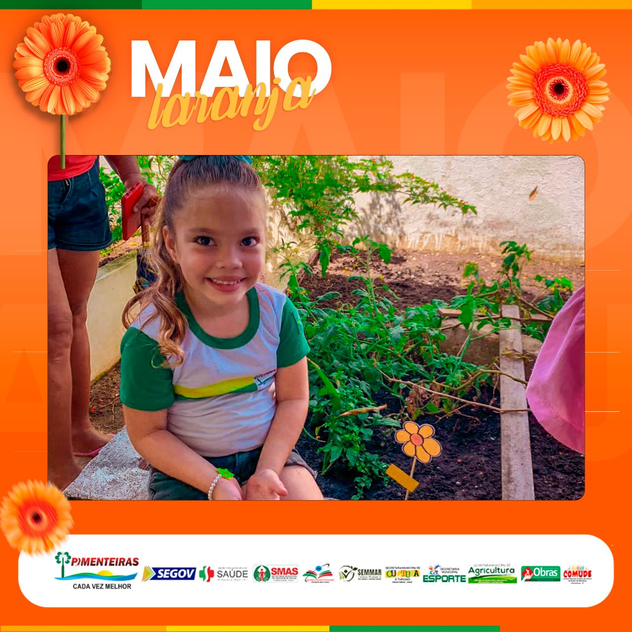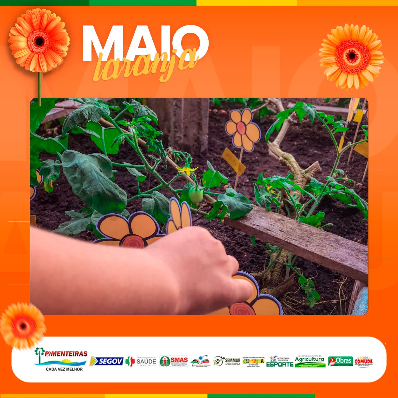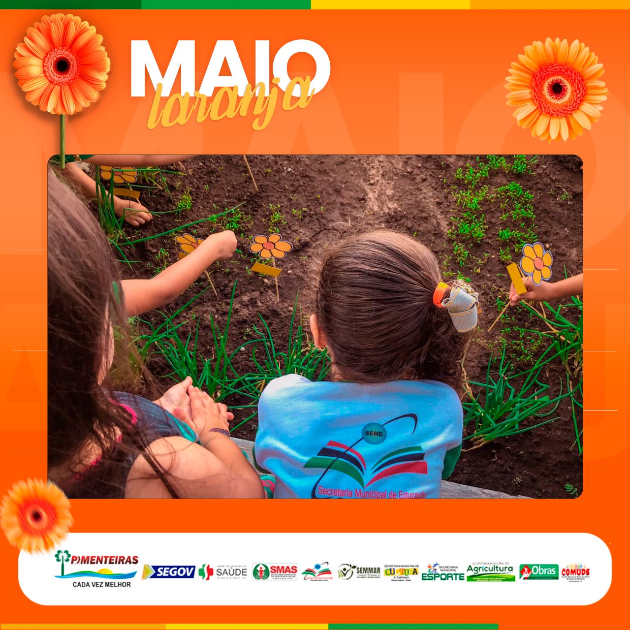 Ao final, pais e filhos puderam plantar uma forte semente, simbolicamente, na horta da creche com uma flor da logomarca da campanha Maio Laranja, depois ganharam gostosuras e lanches.