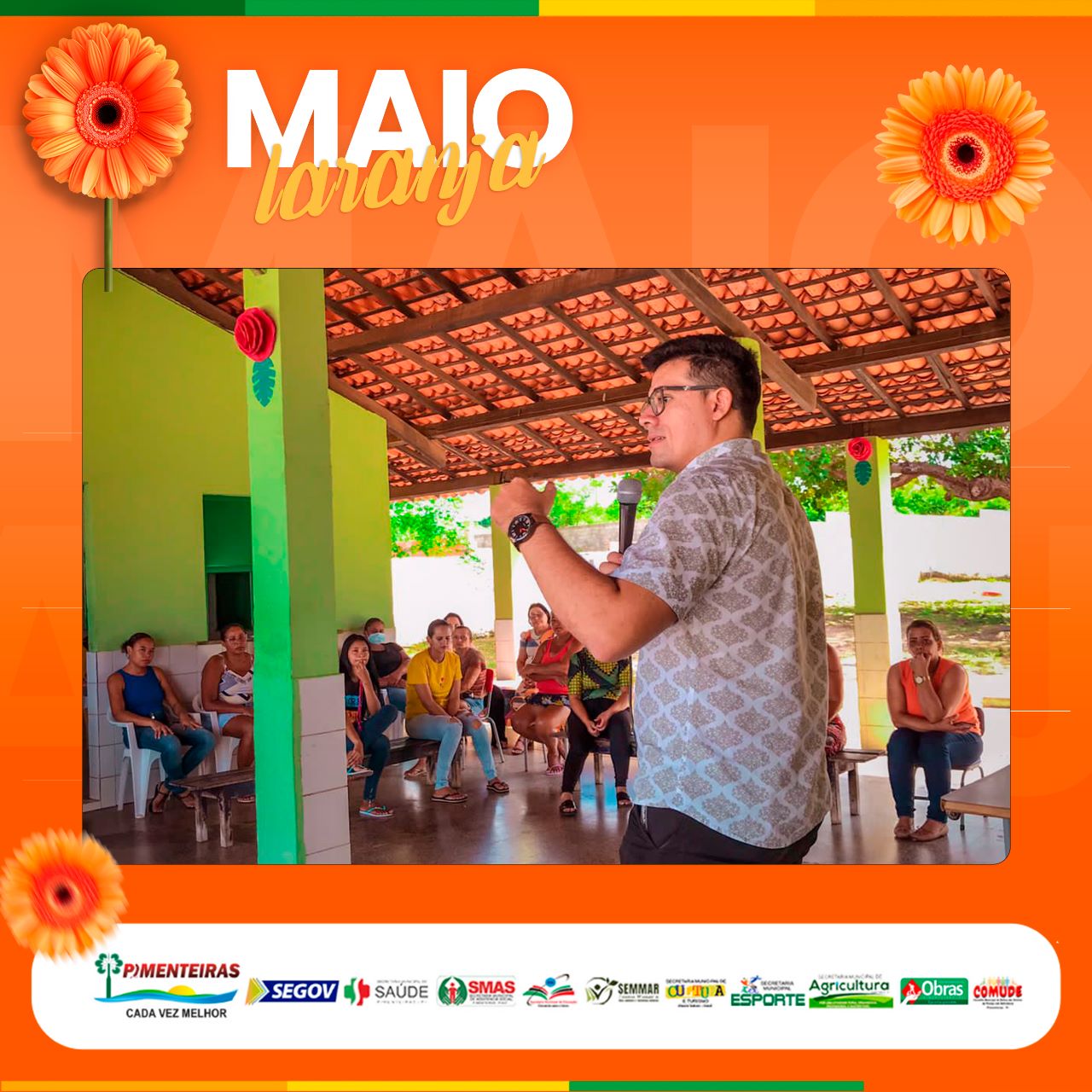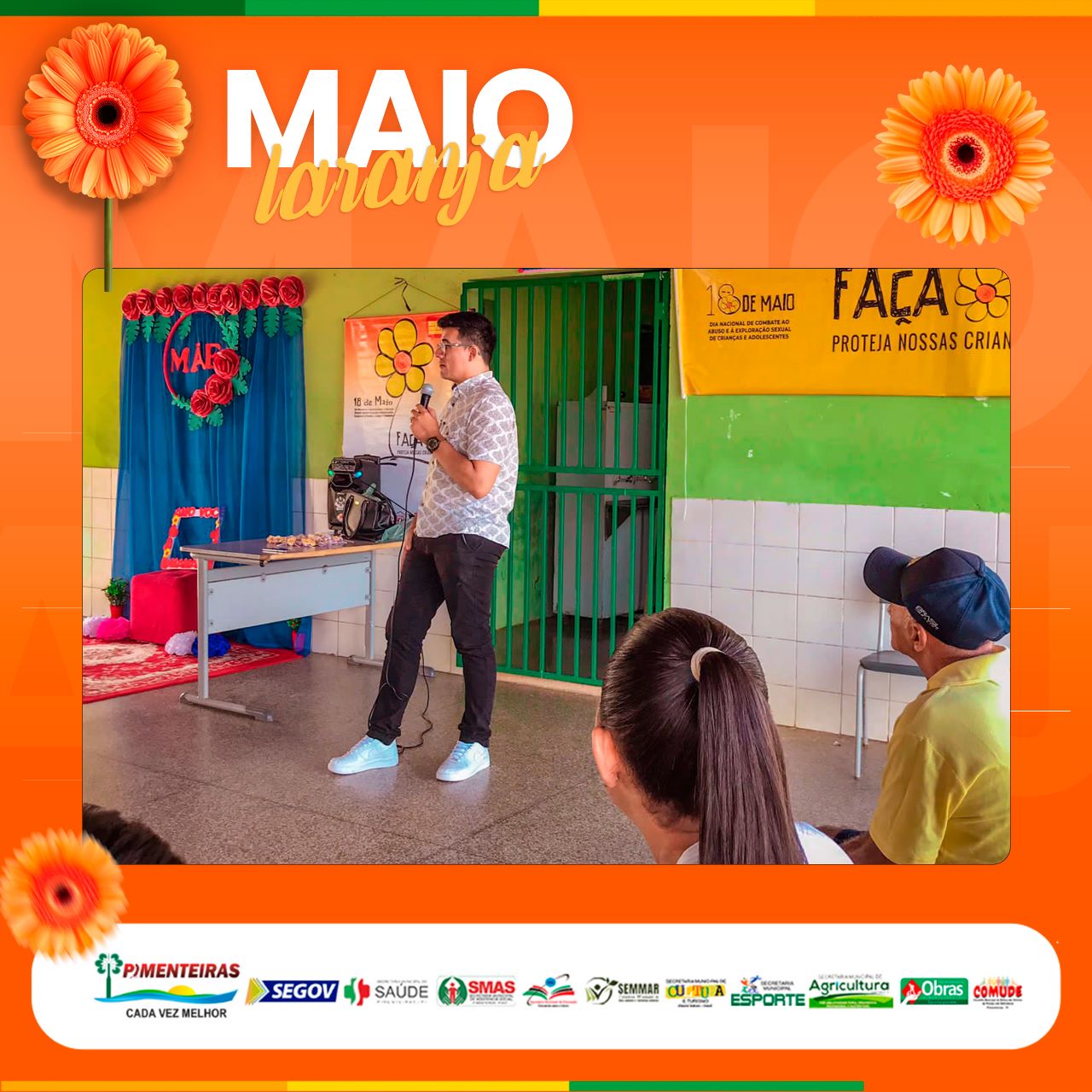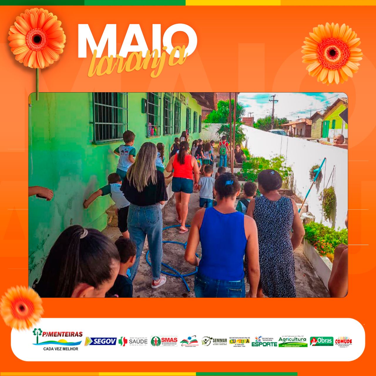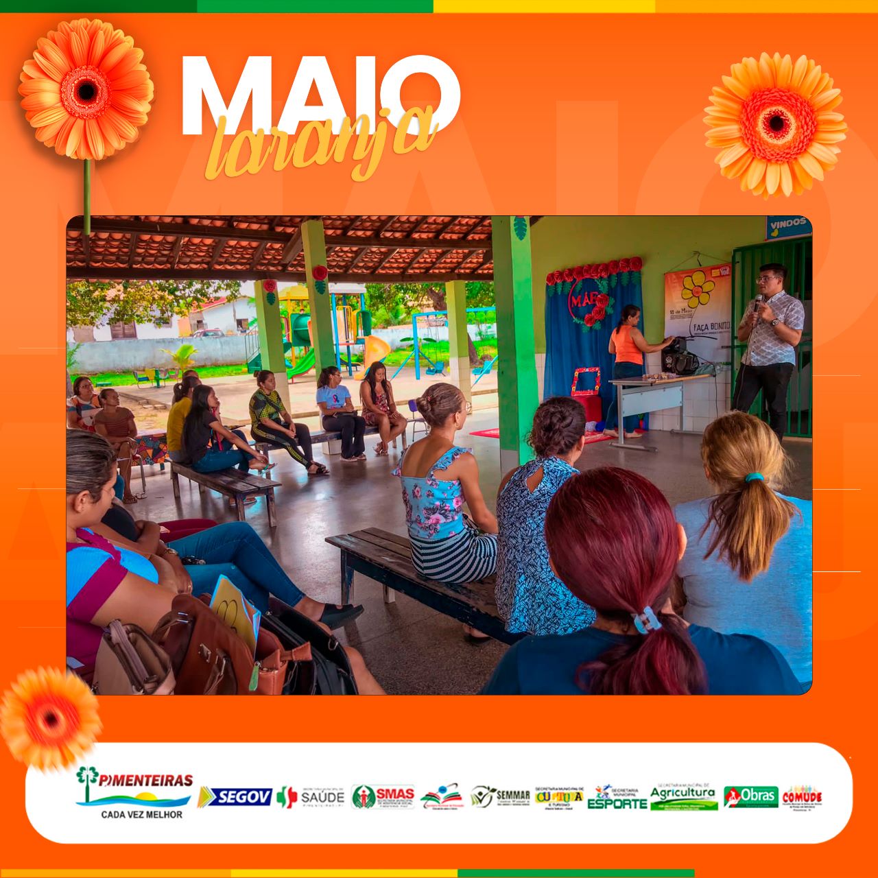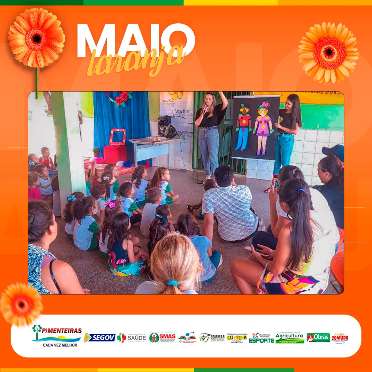 Data: 11/05/2023A Prefeitura Municipal de Pimenteiras, através do Centro de Referência Especializado da Assistência Social (CREAS) da SMAS em parceria com a Secretaria de Educação, reuniu pais, educadores e os pequenos alunos, de 4 a 5 anos, na Creche Tia Isabel, para a última das palestras programadas da campanha Maio Laranja, no intuito de conscientizar todas as faixas etárias, desde infantil, crianças maiores e adolescentes, quanto ao tema do Dia 18/05 - Dia Nacional de Combate ao Abuso e a Exploração Sexual de Crianças e Adolescentes.