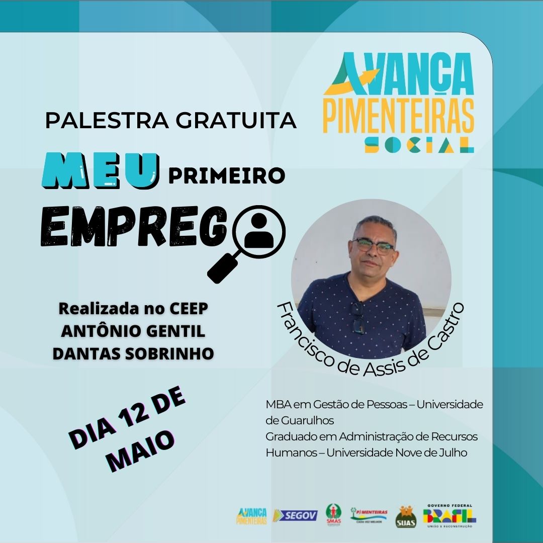 Data: 11/05/2023A Prefeitura Municipal de Pimenteiras, através da Secretaria de Governo, convida aos interessados participar da palestra "Meu Primeiro Emprego" a ser realizada nesta sexta-feira (12/05), às 09h, no CEEP Antonio Gentil Dantas Sobrinho. A palestra será gratuita e trás o especialista em Gestão de Pessoas, o administrador Francisco de Assis Castro como palestrante, dentro do projeto Avança Pimenteiras Social.