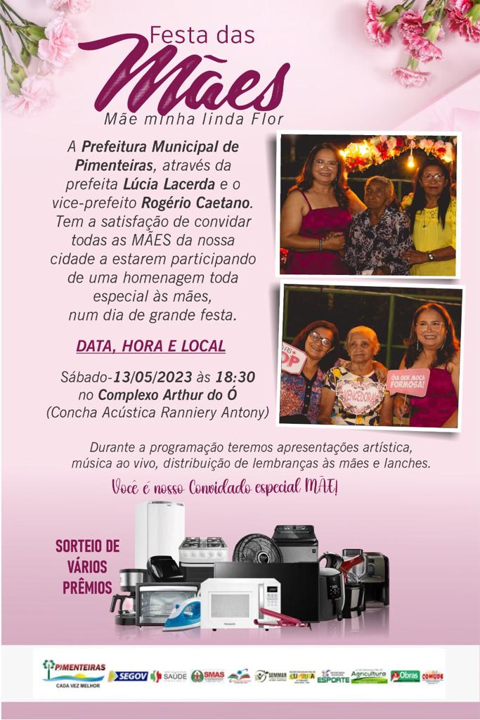 Data: 12/05/2023A Prefeitura Municipal de Pimenteiras, através de sua prefeita Lúcia Lacerda e o vice-prefeito Rogério Caetano, tem a satisfação de convidar todas as MÃES da nossa cidade a estarem participando de uma homenagem toda especial às mães, num dia de grande festa.