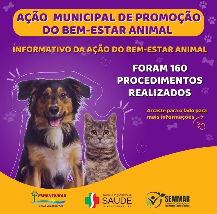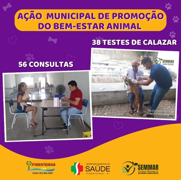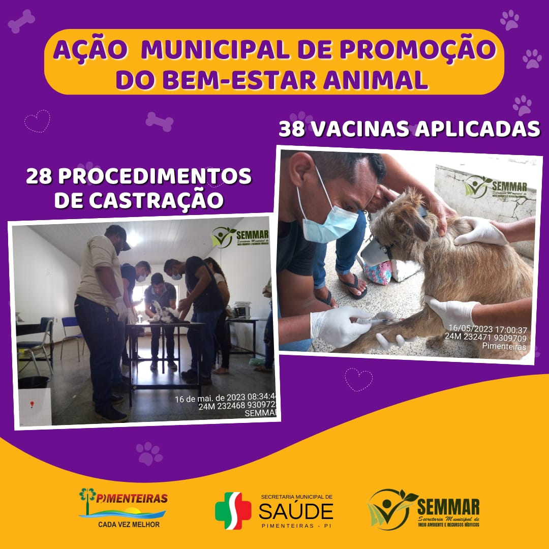 Data: 20/05/2023A Prefeitura Municipal de Pimenteiras-PI, através da Secretaria Municipal de Meio Ambiente e Recursos Hídricos (SEMMAR) e da Secretaria Municipal Saúde pela Coordenação de Vigilância Sanitária, informa a população pimenteirense o total de procedimentos realizados na “Ação Municipal de Promoção do Bem-Estar Animal”.
