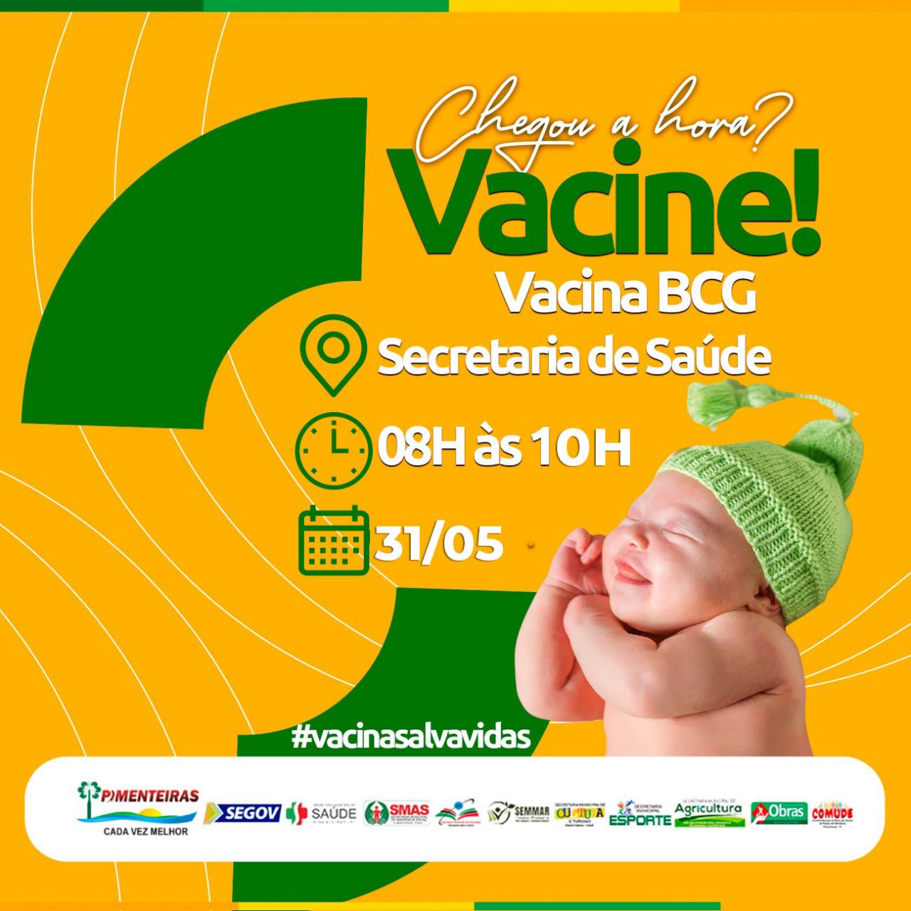 No dia 31/05, das 08h às 10h, a Secretaria de Saúde estará disponibilizando a vacina BCG, de 0 aos 28 dias de vida: recém-nascido. Não perca a oportunidade de proteger seus filhos contra a tuberculose. Compareça à Secretaria de Saúde nesse horário para garantir a imunização. A vacina é gratuita e de extrema importância para a saúde de nossas crianças.