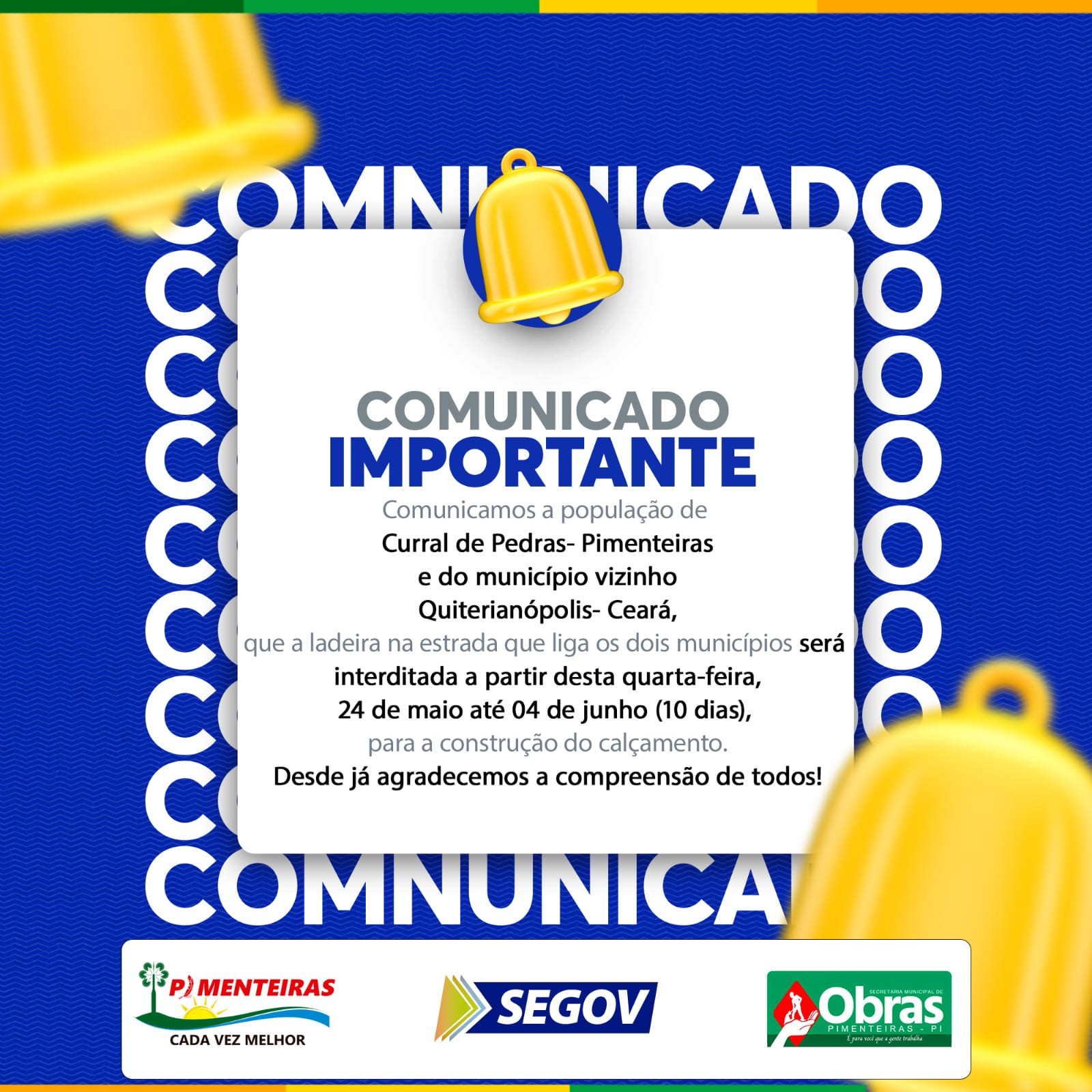 Data: 23/05/2023Comunicamos a população de Curral de Pedras- Pimenteiras e do município vizinho