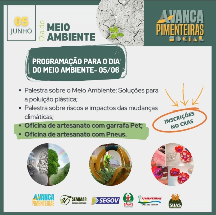 Data: 01/06/2023O Programa Avança Pimenteiras Social, através da Prefeitura Municipal de Pimenteiras e suas Secretarias SEMMAR, SMAS e SEGOV, convida aos interessados a se inscreverem nas Oficinas de Artesanato em Pneus e Garrafas Pets que será realizada pela passagem do dia 05 de junho - Dia do Meio Ambiente .