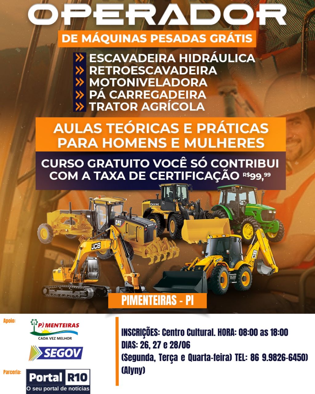 Data: 13/06/2023A Prefeitura Municipal de Pimenteiras, através da Secretaria de Governo, convida você a aprender a operar máquinas pesadas como escavadeira hidráulica, retroescavadeira, motoniveladora, pá carregadeira e trator agrícola. Este curso oferece aulas teóricas e práticas, aberto para homens e mulheres interessados em adquirir habilidades valiosas para o mercado de trabalho.