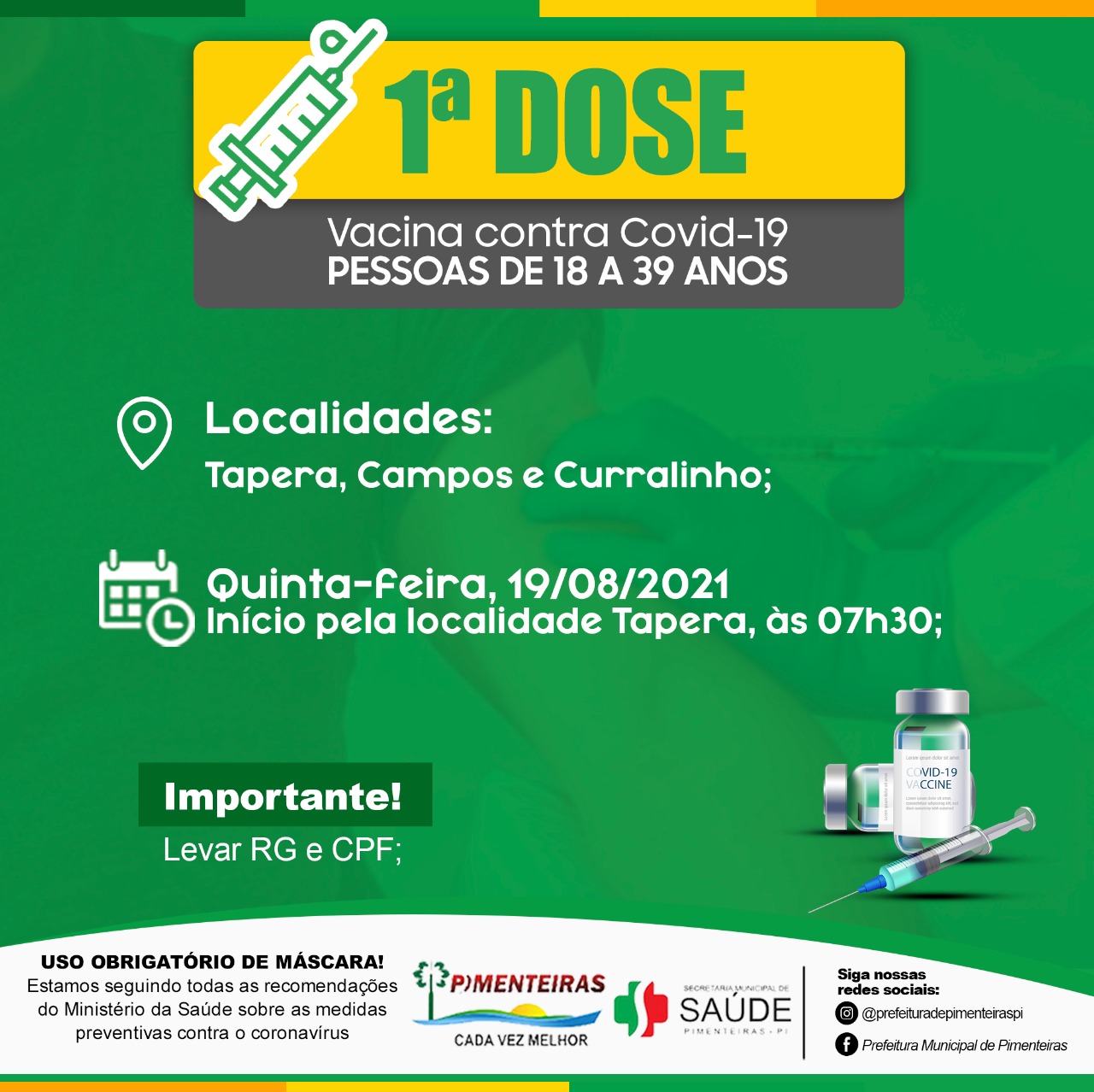 Data: 18/08/2021A Secretaria Municipal de Saúde de Pimenteiras divulgou nova faixa etaria de idade a ser vacinada com a 1ª dose da vacina contra covid19 na Zona Rural de Municipio de Pimenteiras - PI.