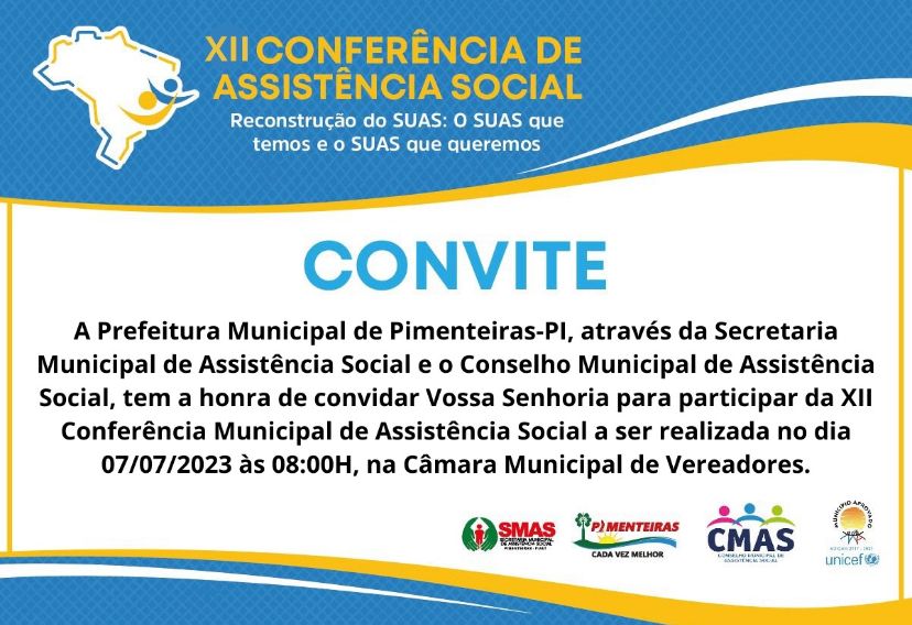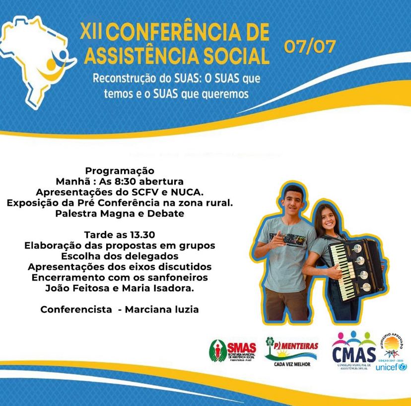 Data: 04/07/2023A Prefeitura de Pimenteiras, através da Secretaria Municipal de Assistência Social (SMAS) e seu Conselho Municipal de Assistência Social, promoverá a XII Conferência de Assistência Social nesta sexta-feira (07/07), com o tema central: "Reconstrução do SUAS: o SUAS que temos e o SUAS que queremos".