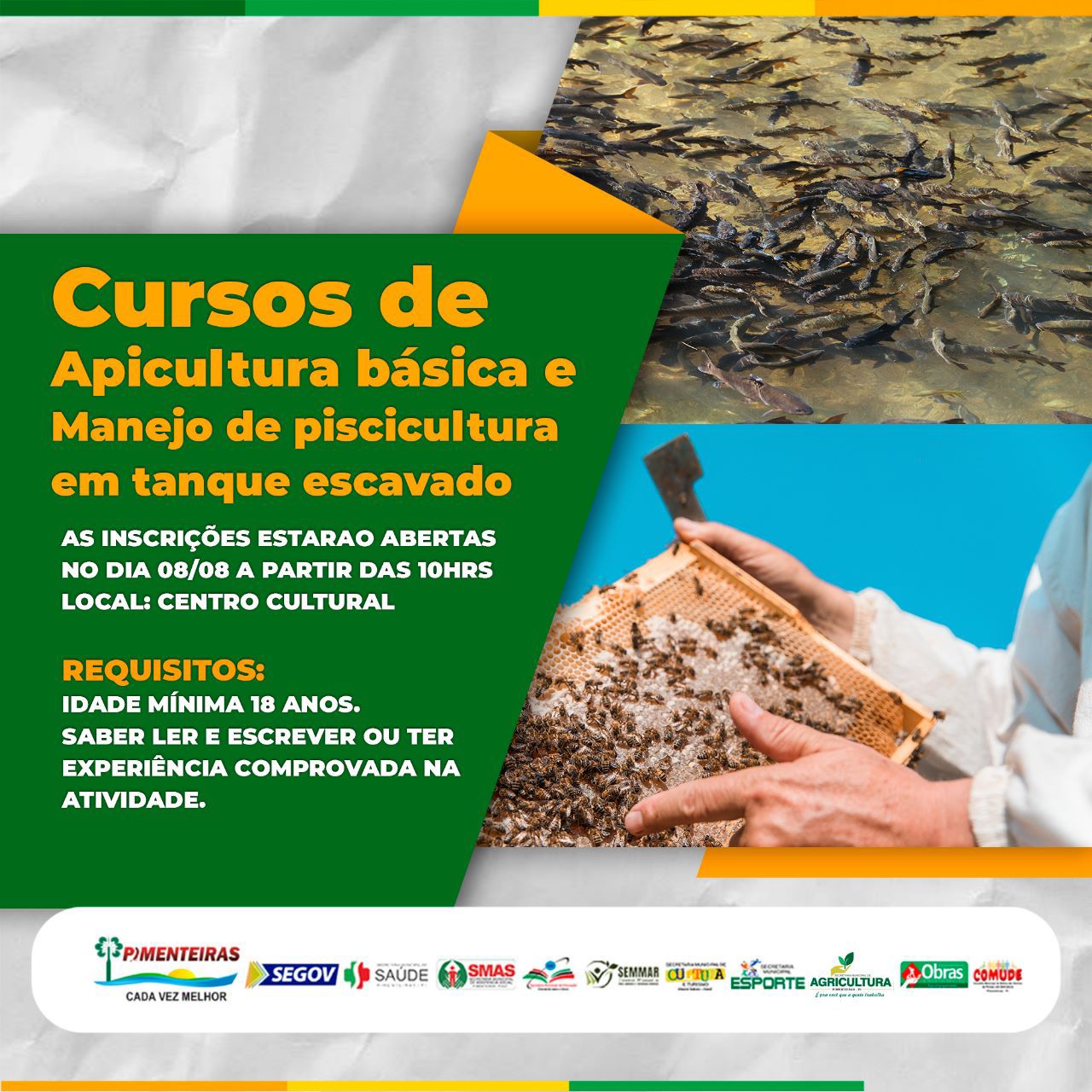 Inscrições dia 08/08 para Cursos Apicultura Básica e Manejo de Psicultura