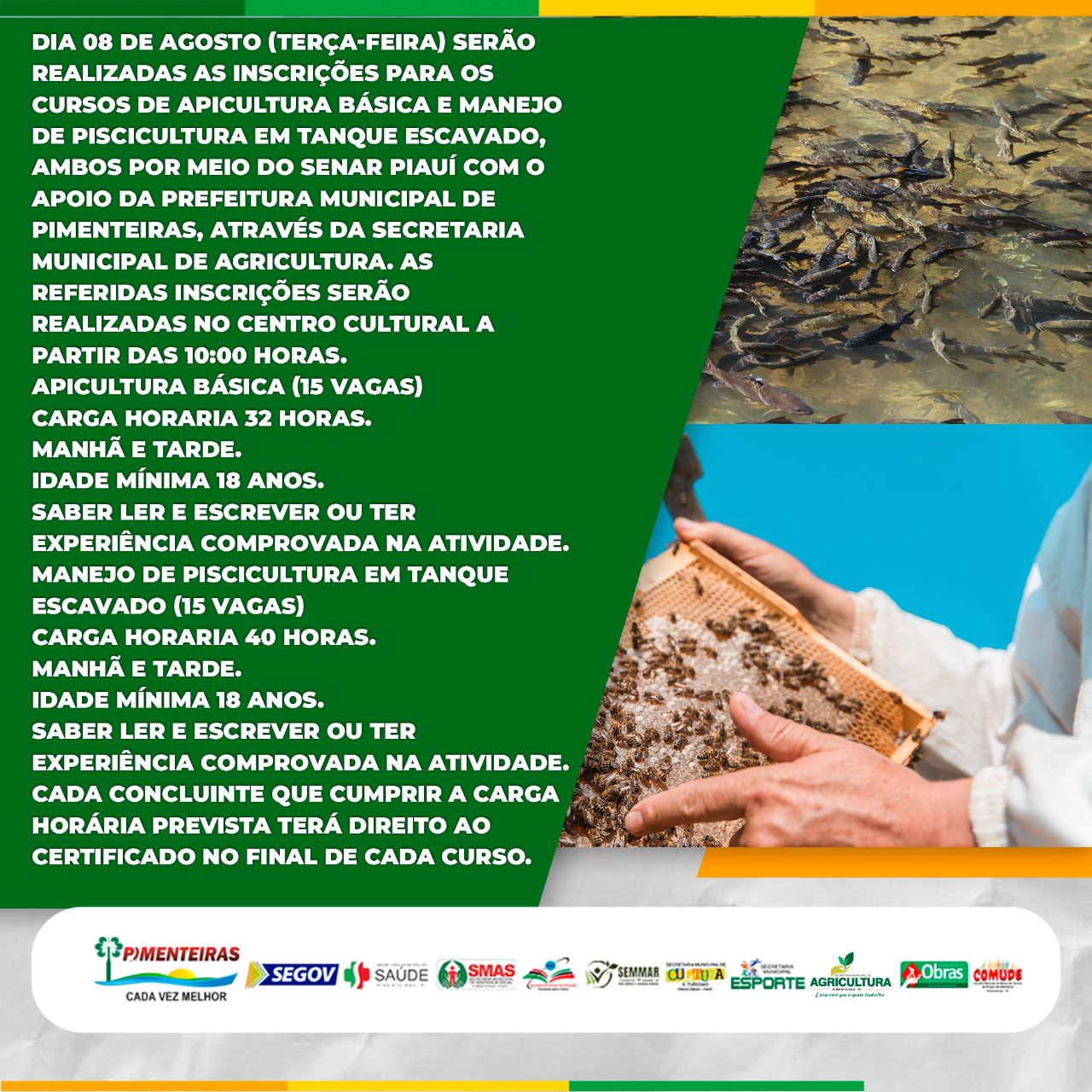 Data: 07/08/2023A Prefeitura Municipal de Pimenteiras, através da Secretária de Agricultura, está apoiando dia 08 de agosto (terça-feira) as inscrições para os cursos de Apicultura básica e Manejo de piscicultura em tanque escavado, ambos por meio do SENAR Piauí.