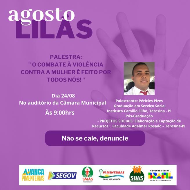 Data: 22/08/2023O Projeto Avança Pimenteiras Social, através do Centro de Referência de Assistência Social-CRAS, está trazendo a Pimenteiras neste Agosto Lilás, a palestra "O Combate à Violência Contra a Mulher é Feito por Todos Nós", a ser realizada nessa quinta-feira (24/08), na Câmara dos Vereadores , às 09h.