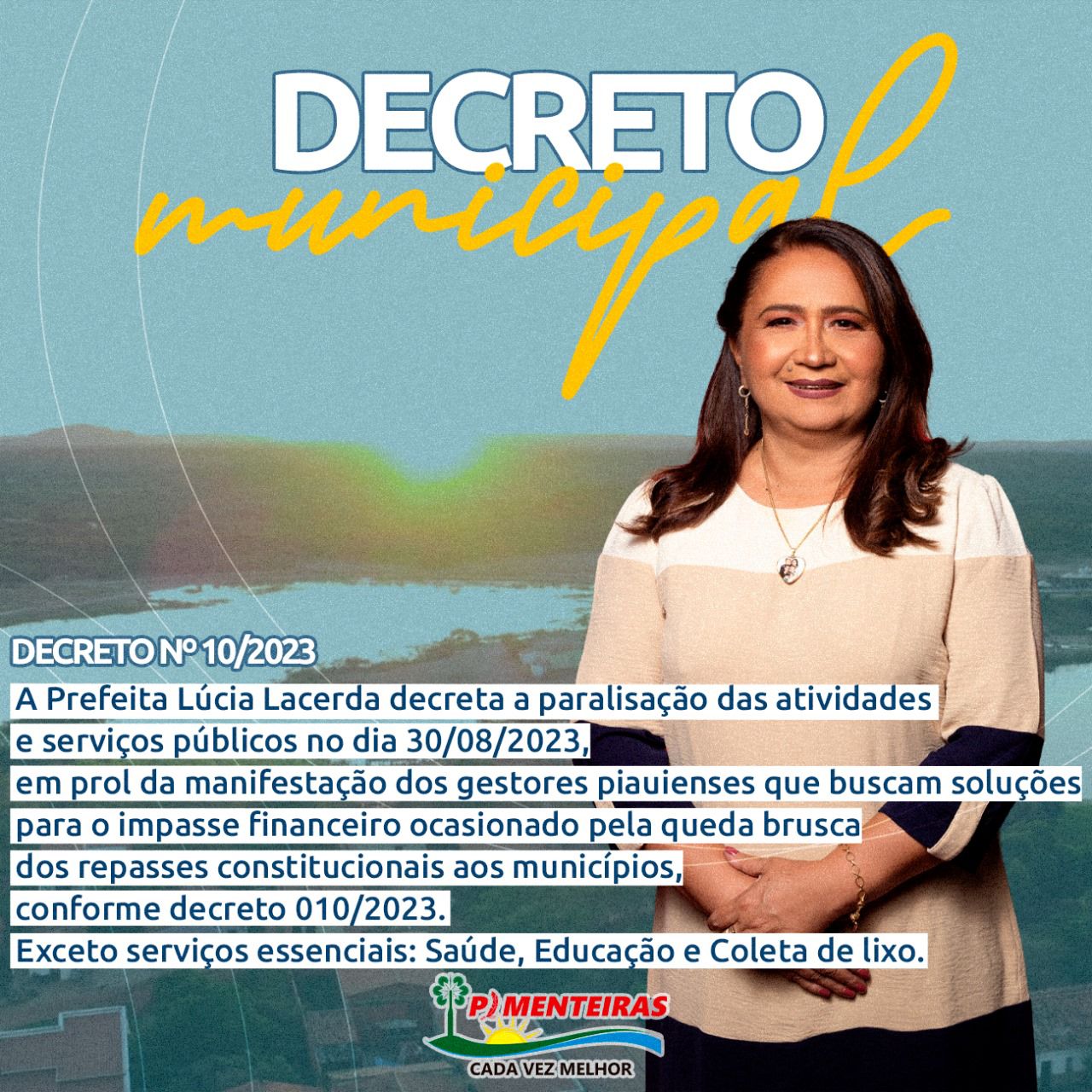 Data: 29/08/2023A Prefeita Lúcia Lacerda decreta a paralisação das atividades e serviços públicos no dia 30/08/2023, em prol da manifestação dos gestores piauienses, que buscam soluções para o impasse financeiro ocasionado pela queda brusca dos repasses constitucionais aos municípios, conforme o decreto 010/2023.