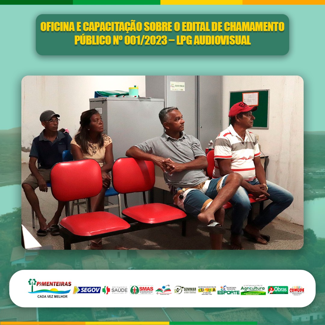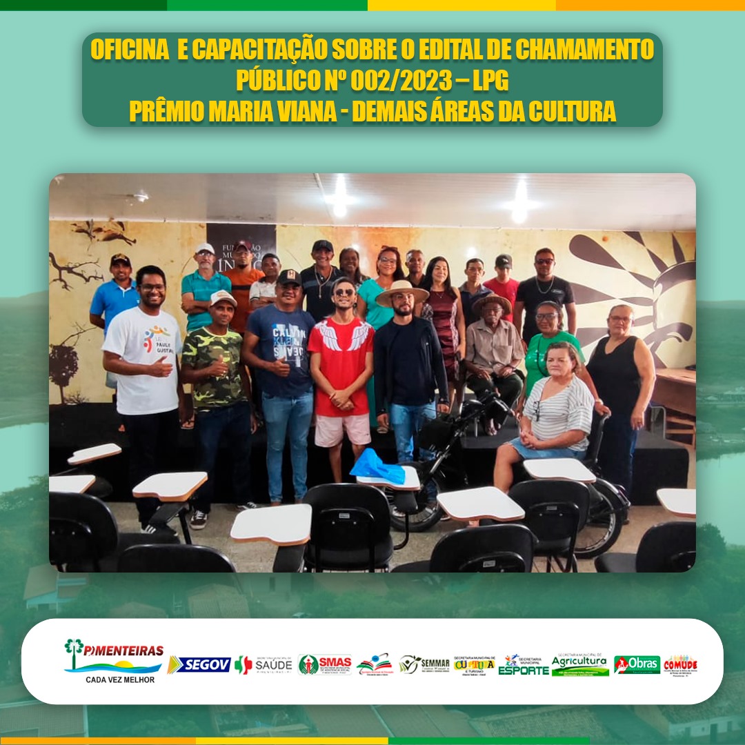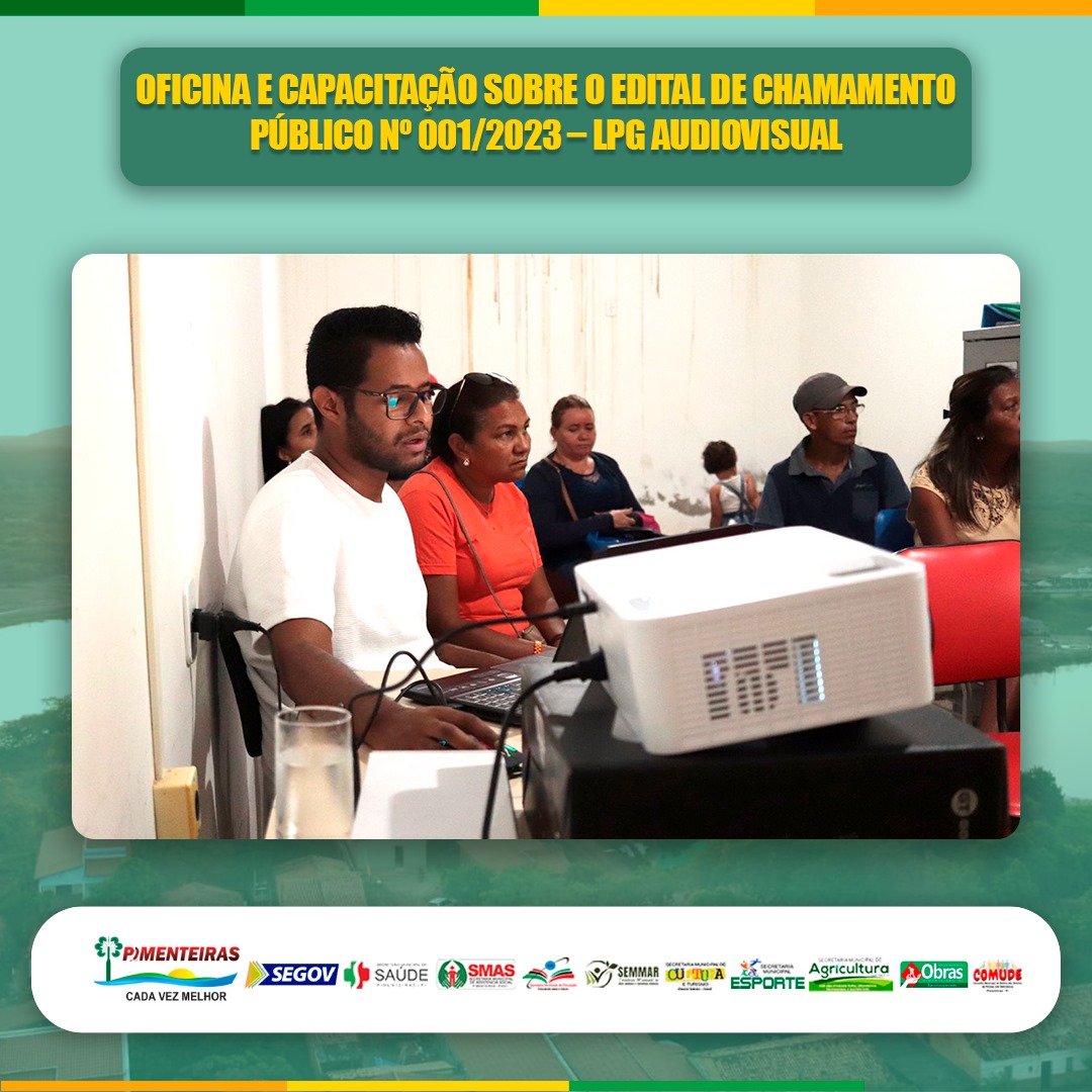 Data: 01/09/2023A Prefeitura Municipal de Pimenteiras - PI, através da Secretaria Municipal de Cultura e Turismo (SEMCT), entre os dias 31/08 e 01/09, realizou oficinas e capacitações sobre as inscrições de projetos e iniciativas culturais nos editais (N° 001/2023 - LPG AUDIOVISUAL e N° 002/2023 LPG - DEMAIS ÁREAS DA CULTURA), da Lei Paulo Gustavo, no município de Pimenteiras.