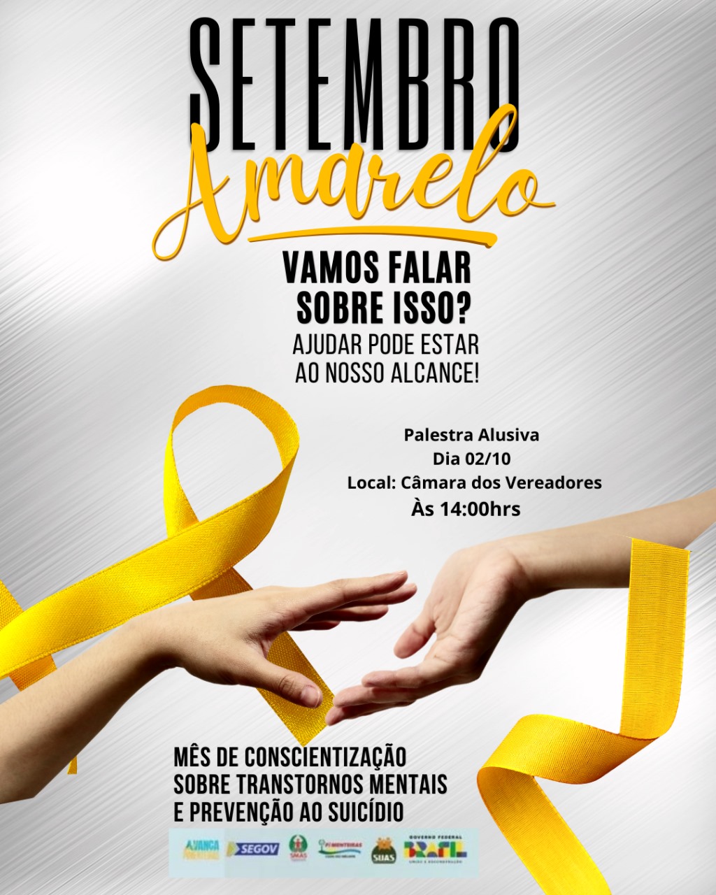 O evento acontecerá nesta segunda-feira, dia 02/10, na Câmara Municipal de Vereadores, às 14h. Junte-se a nós nessa importante conversa para apoiar quem precisa e promover a saúde mental em nossa comunidade. Contamos com a sua presença!
