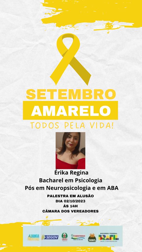 Data: 02/10/2023A Prefeitura Municipal de Pimenteiras tem a honra de convidar toda a população para a palestra alusiva ao Setembro Amarelo, mês de conscientização sobre transtornos mentais e prevenção ao suicídio.