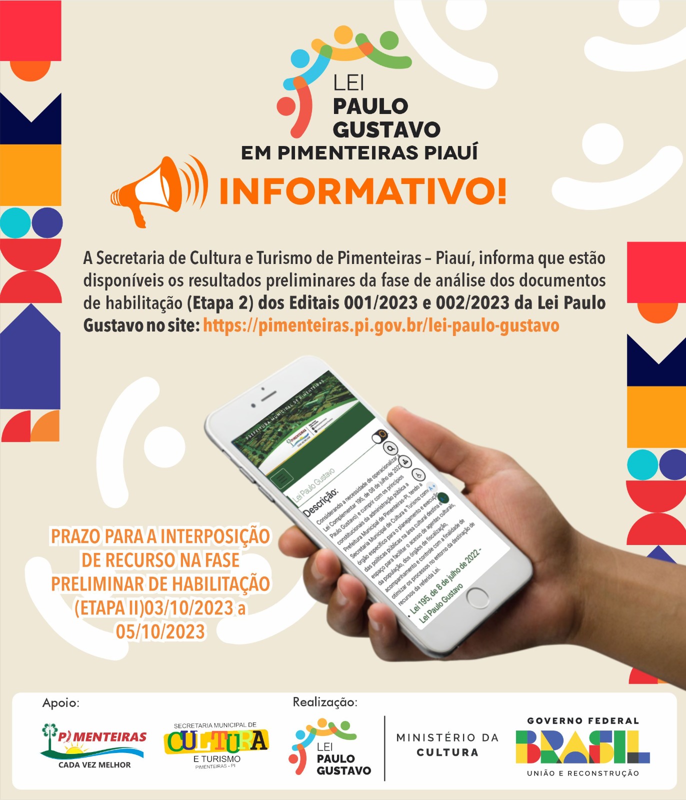 Data: 03/10/2023A Secretaria De Cultura e Turismo de Pimenteiras – Piauí, informa que estão disponíveis os resultados preliminares da fase de análise dos documentos de habilitação (Etapa 2) dos Editais 001/2023 e 002/2023 da Lei Paulo Gustavo no site: