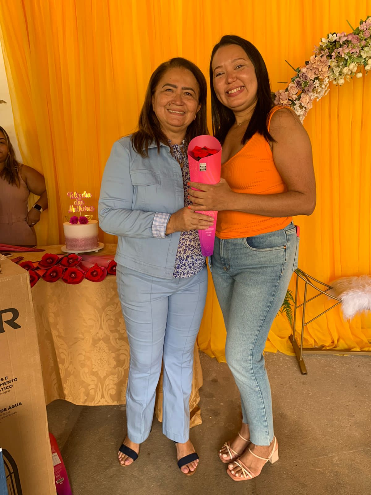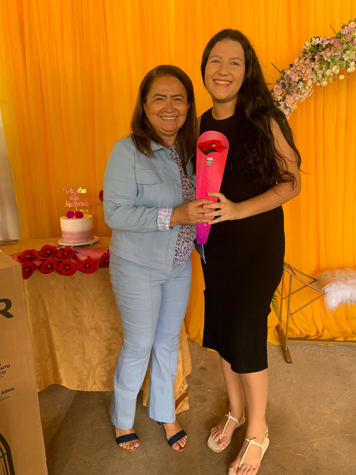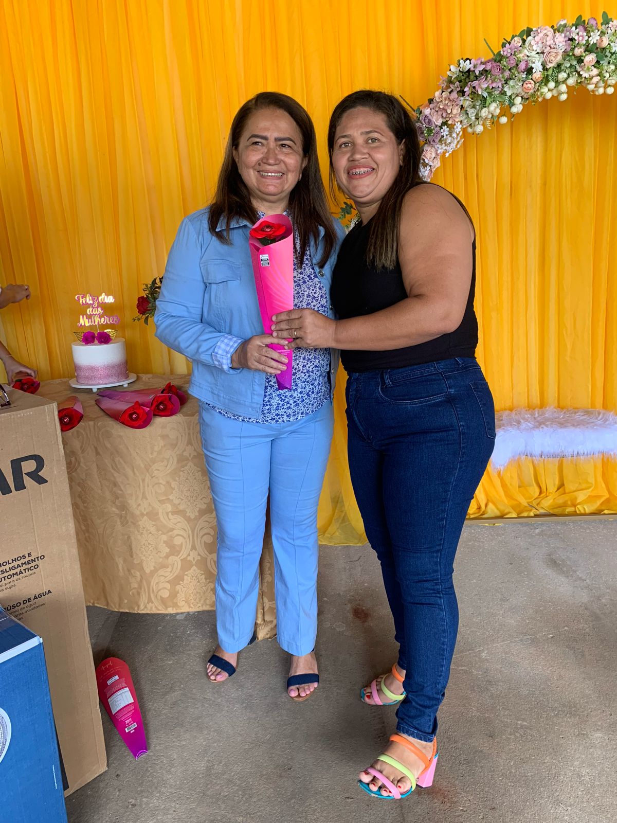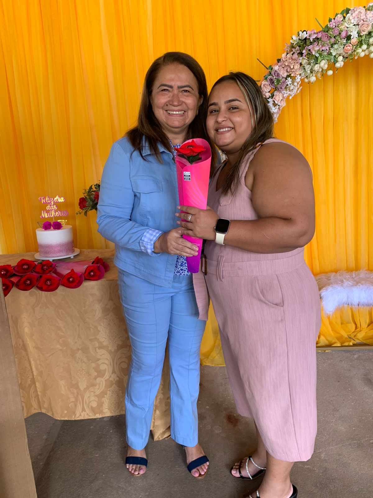 O local todo decorado especialmente às mulheres, com flores para todos os gostos e cores, visto que a lembrancinha era um botão de rosa vermelha com um chocolate de uma marca renomada, além de um belíssimo arco de flores, arranjo, bolo e café da manhã especial, tudo feito com muito carinho pra elas que deixam nossa cidade ainda mais bonita, com o zelo pela limpeza das ruas.
