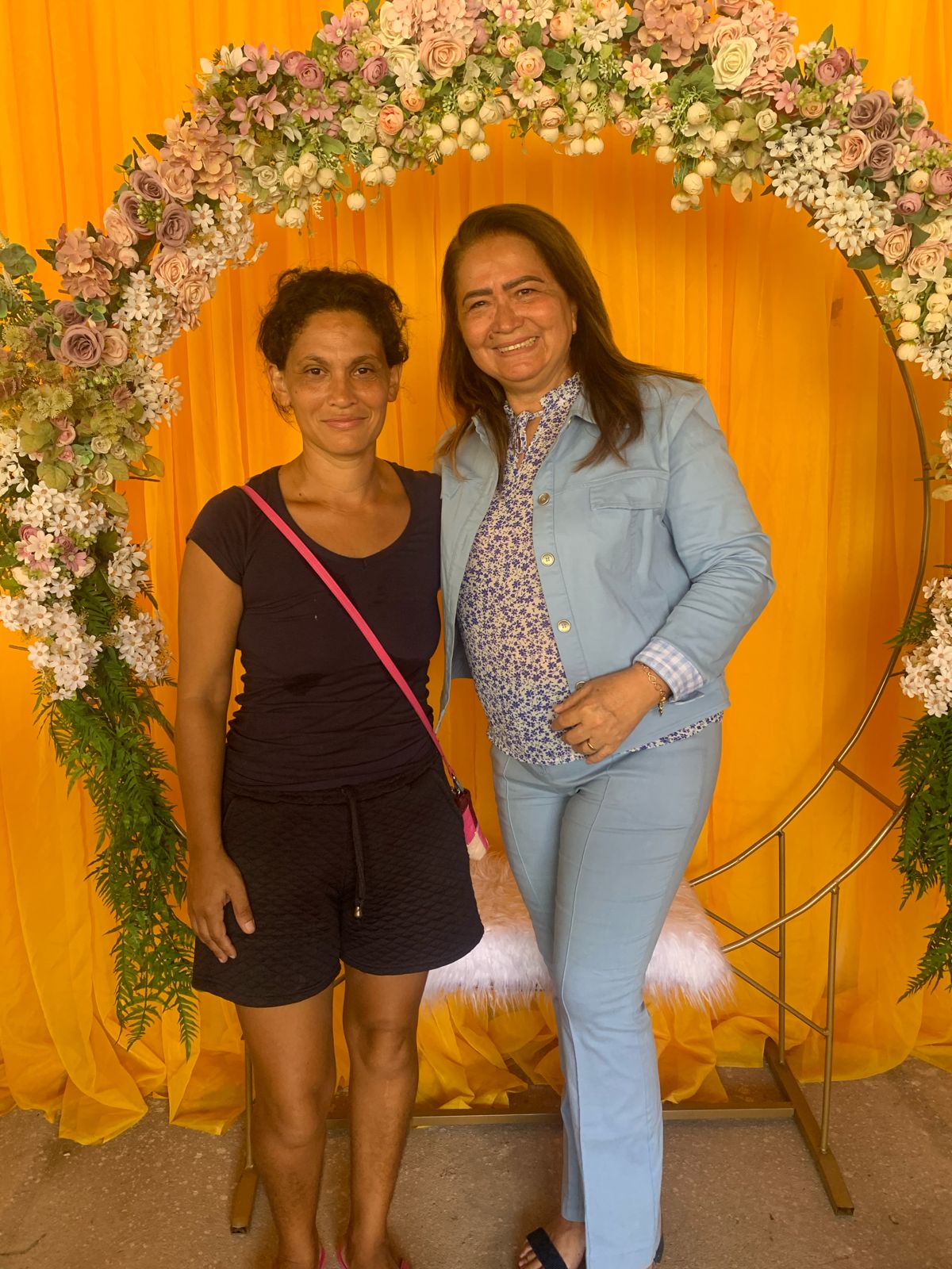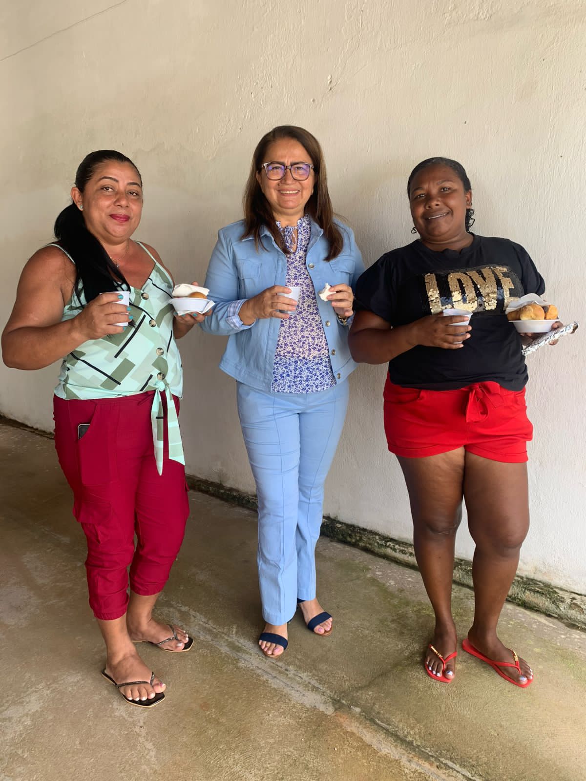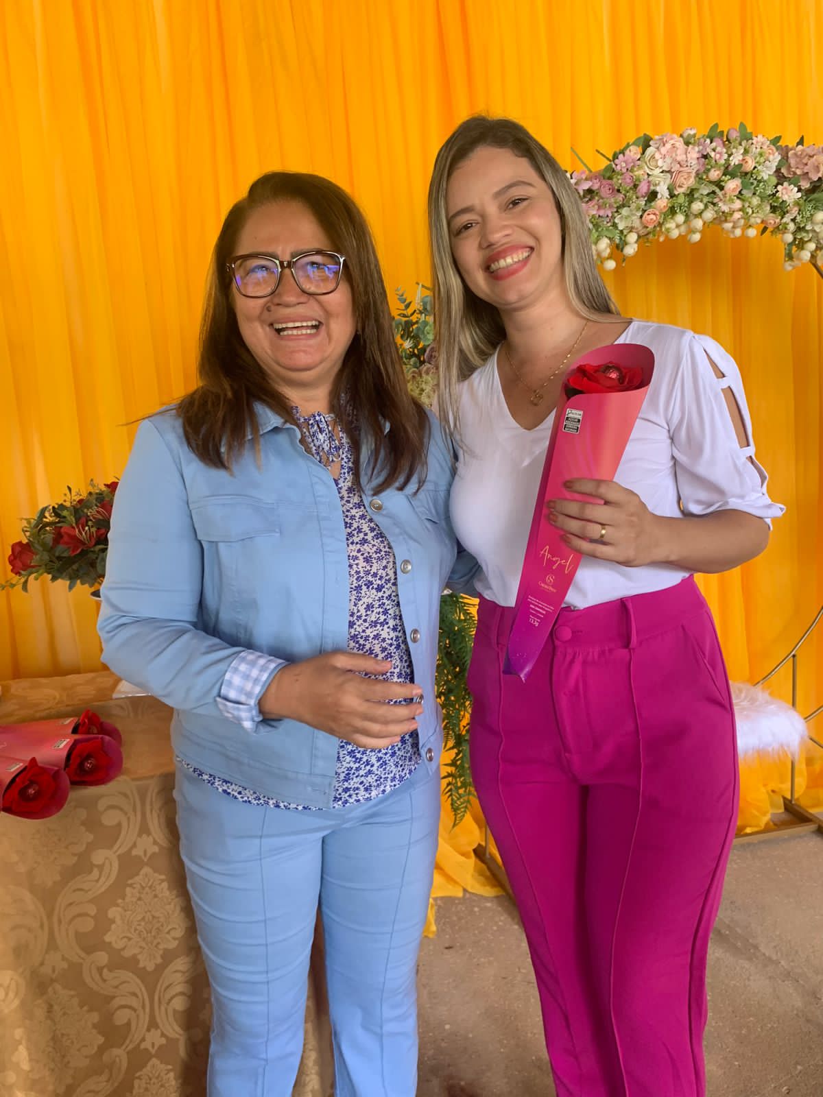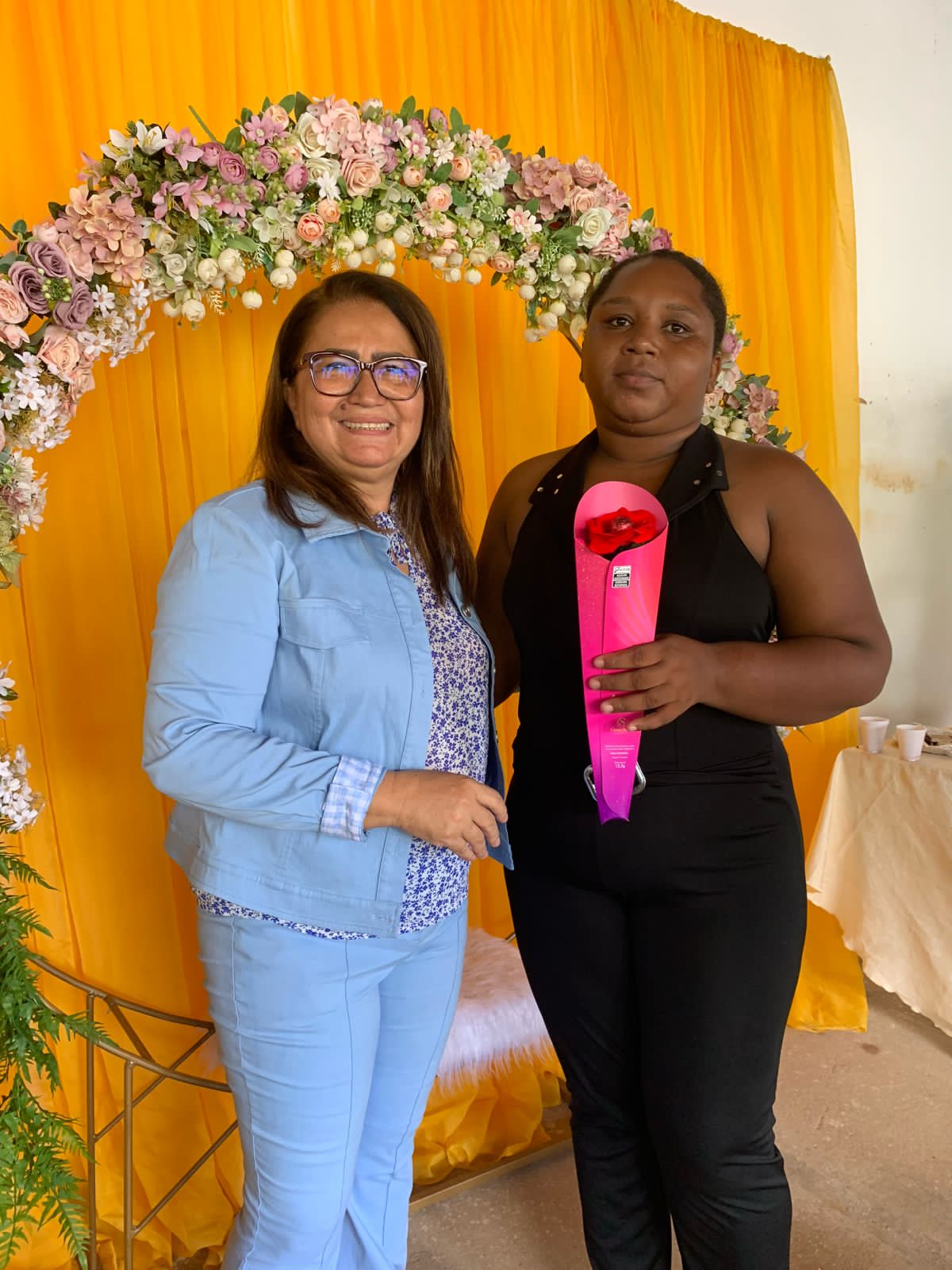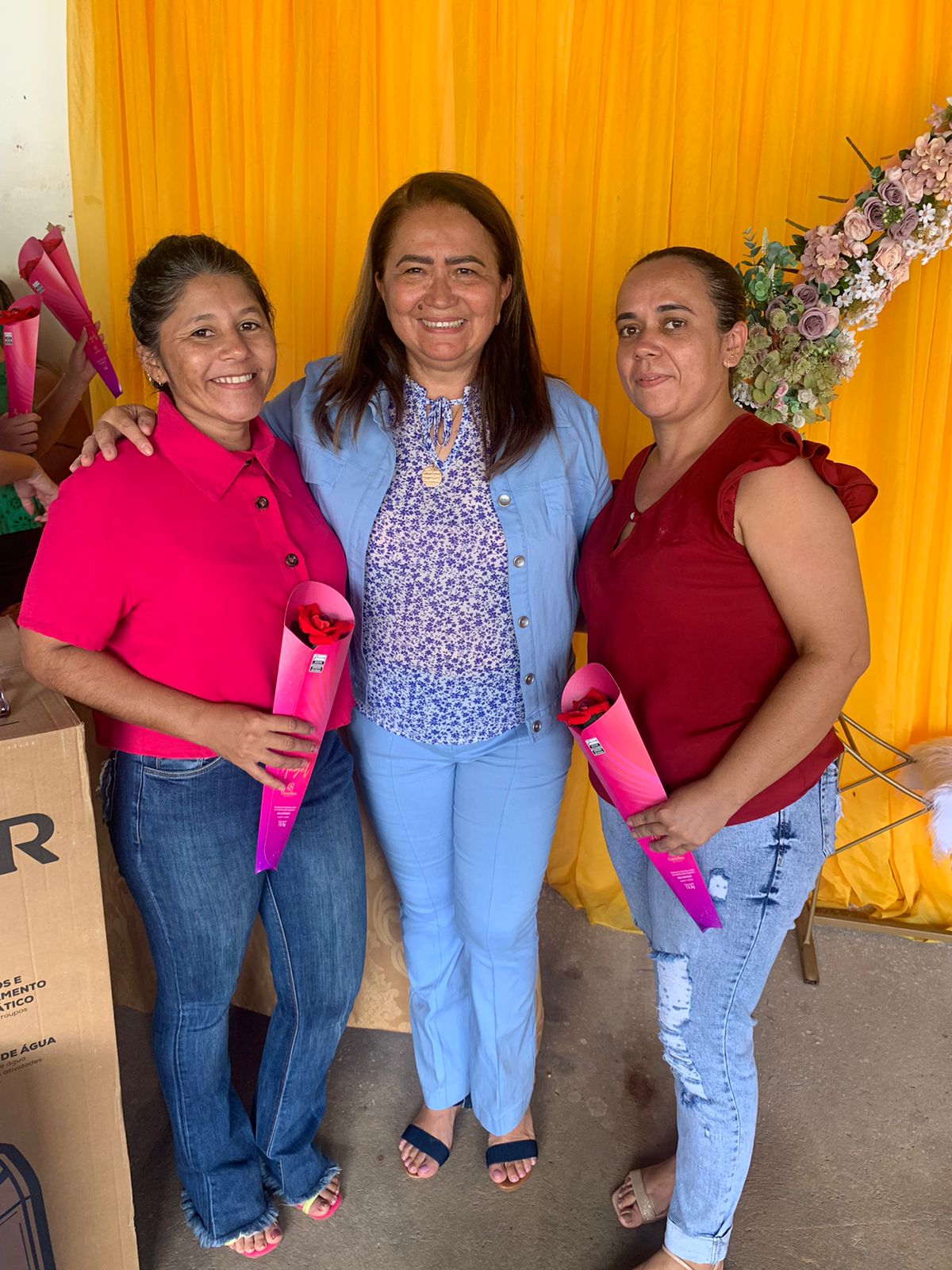 O local todo decorado especialmente às mulheres, com flores para todos os gostos e cores, visto que a lembrancinha era um botão de rosa vermelha com um chocolate de uma marca renomada, além de um belíssimo arco de flores, arranjo, bolo e café da manhã especial, tudo feito com muito carinho pra elas que deixam nossa cidade ainda mais bonita, com o zelo pela limpeza das ruas.