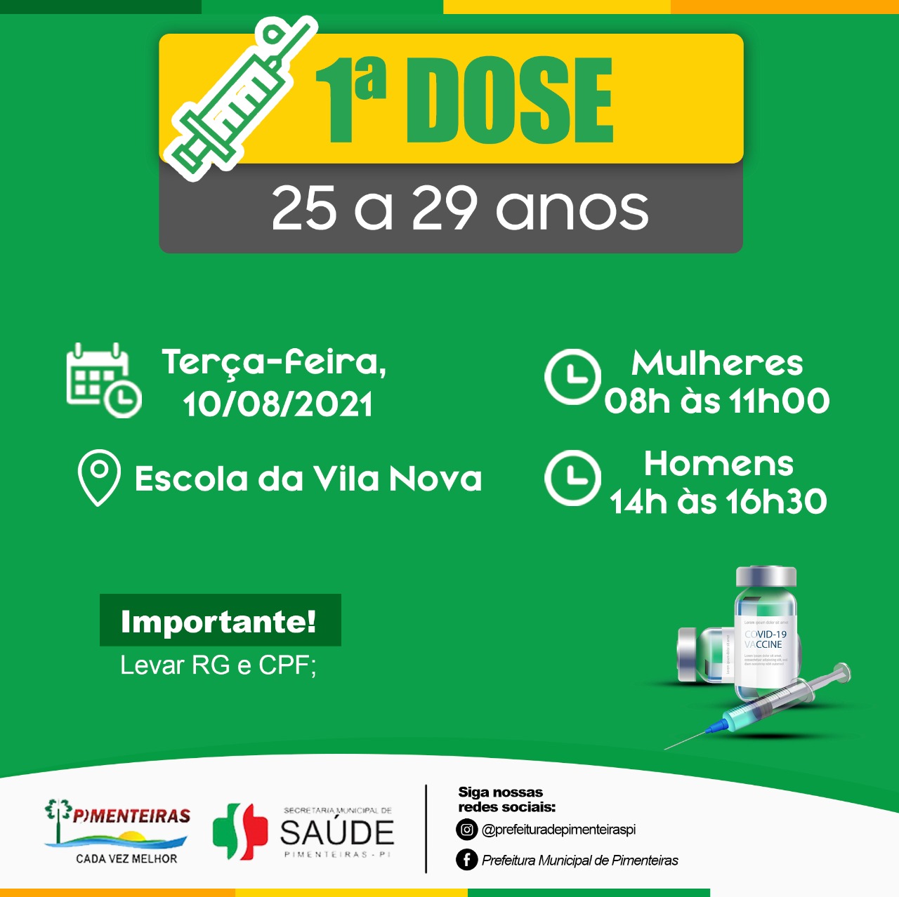 - 10 de Agosto de 2021 de 08:00 às 11:00 e 14:00 às 16:30 na escola da Vila Nova, seram realizadas vacinação da 1ª Dose da Vacina Contra Covid19 na pessoas entre 25 e 29 anos de idade.