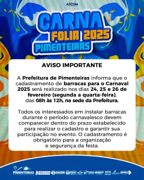 A Prefeitura de Pimenteiras informa que o cadastramento de barracas para o Carnaval 2025 será realizado nos dias 24, 25 e 26 de fevereiro (segunda a quarta-feira), das 08h às 12h, na sede da Prefeitura.