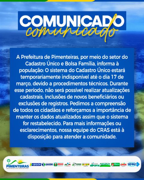 Data: 07/03/2025A Prefeitura Municipal de Pimenteiras, através do Centro de Referência de Assistência Social (CRAS), informa que os programas sociais: Cadastro Único e Bolsa Família, estarão fora do ar até 17 de março, devido a procedimentos técnicos. Durante esse período não será possível realizar atualizações cadastrais, inclusão de novos beneficiários ou exclusões de registros.