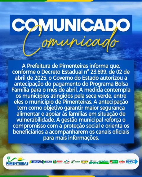 Por meio do Decreto Estadual nº 23.699/2025, o Governo do Estado autorizou a antecipação do pagamento do benefício em abril para os municípios atingidos pela seca verde