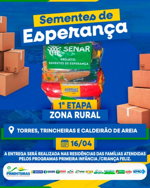Nesta quarta-feira, 16 de abril, teve início a 1ª etapa do projeto Sementes de Esperança, com a entrega de cestas básicas para as famílias da zona rural atendidas pelos programas Primeira Infância/Criança Feliz.