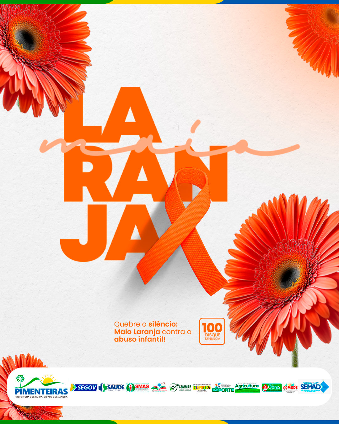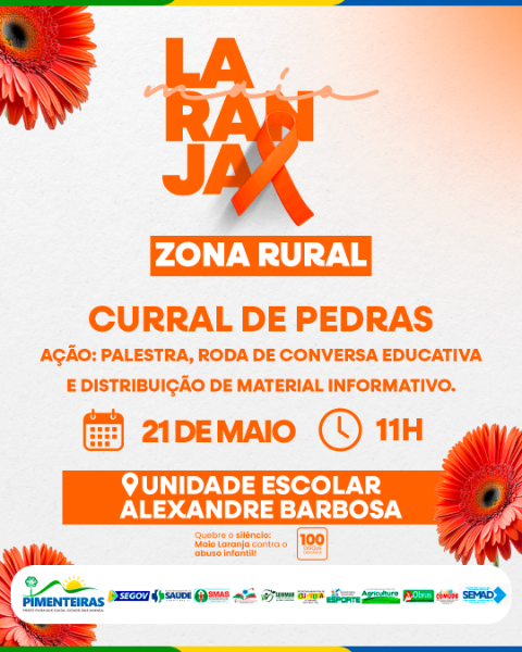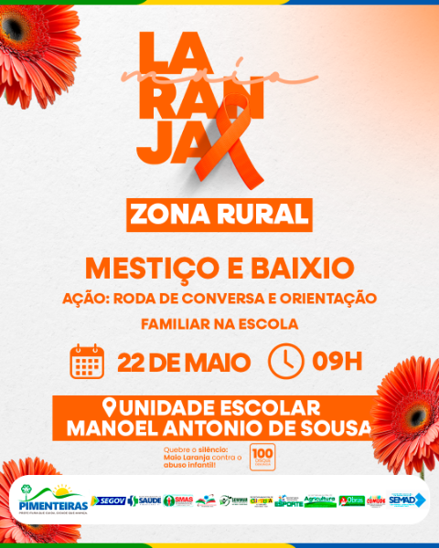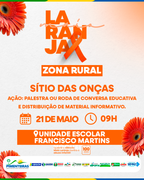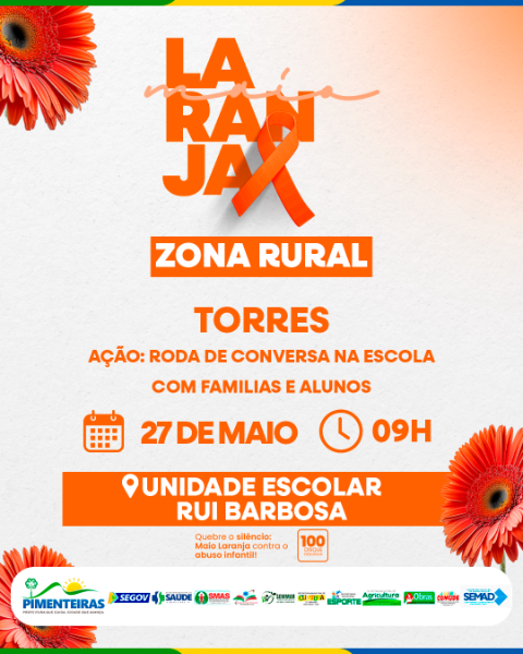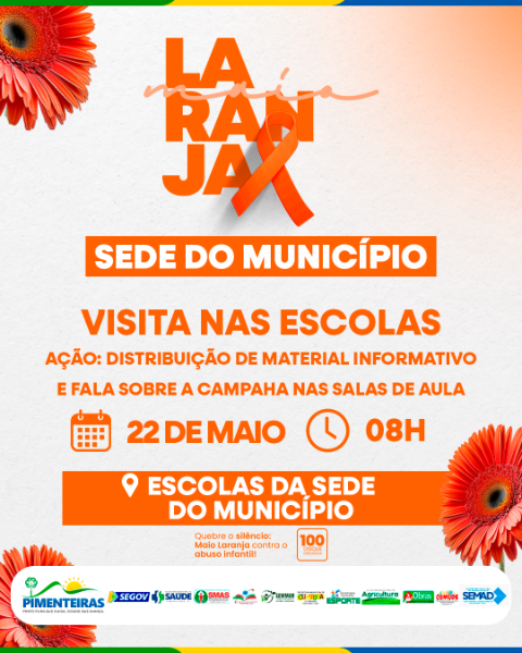 A campanha Maio Laranja, voltada à prevenção e ao combate ao abuso e à exploração sexual de crianças e adolescentes, segue com uma série de atividades no município de Pimenteiras, promovidas pela Prefeitura, por meio da Secretaria Municipal de Assistência Social, do Centro de Referência Especializado de Assistência Social (CREAS) e em parceria com o Conselho Tutelar, Secretaria de Educação, Secretaria de Saúde, CRAS e NUCA.