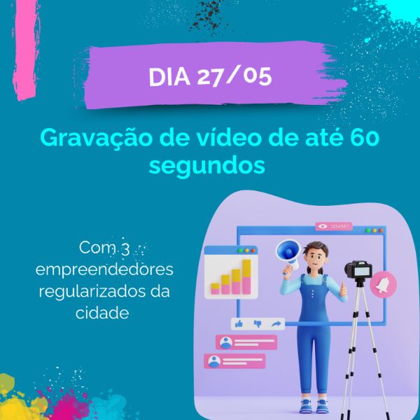 Dia 27/05 Gravação de vídeo de até 60 segundos com 3 empreendedores regularizados da cidade