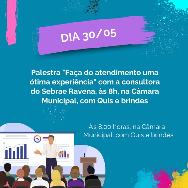 Dia 30/05 Palestra "Faça do atendimento uma ótima experiência" com o consultor do Sebrae Marciel Lopes (substituindo Ravena por questões pessoais), às 8h, na Câmara Municipal, com Quis e brindes